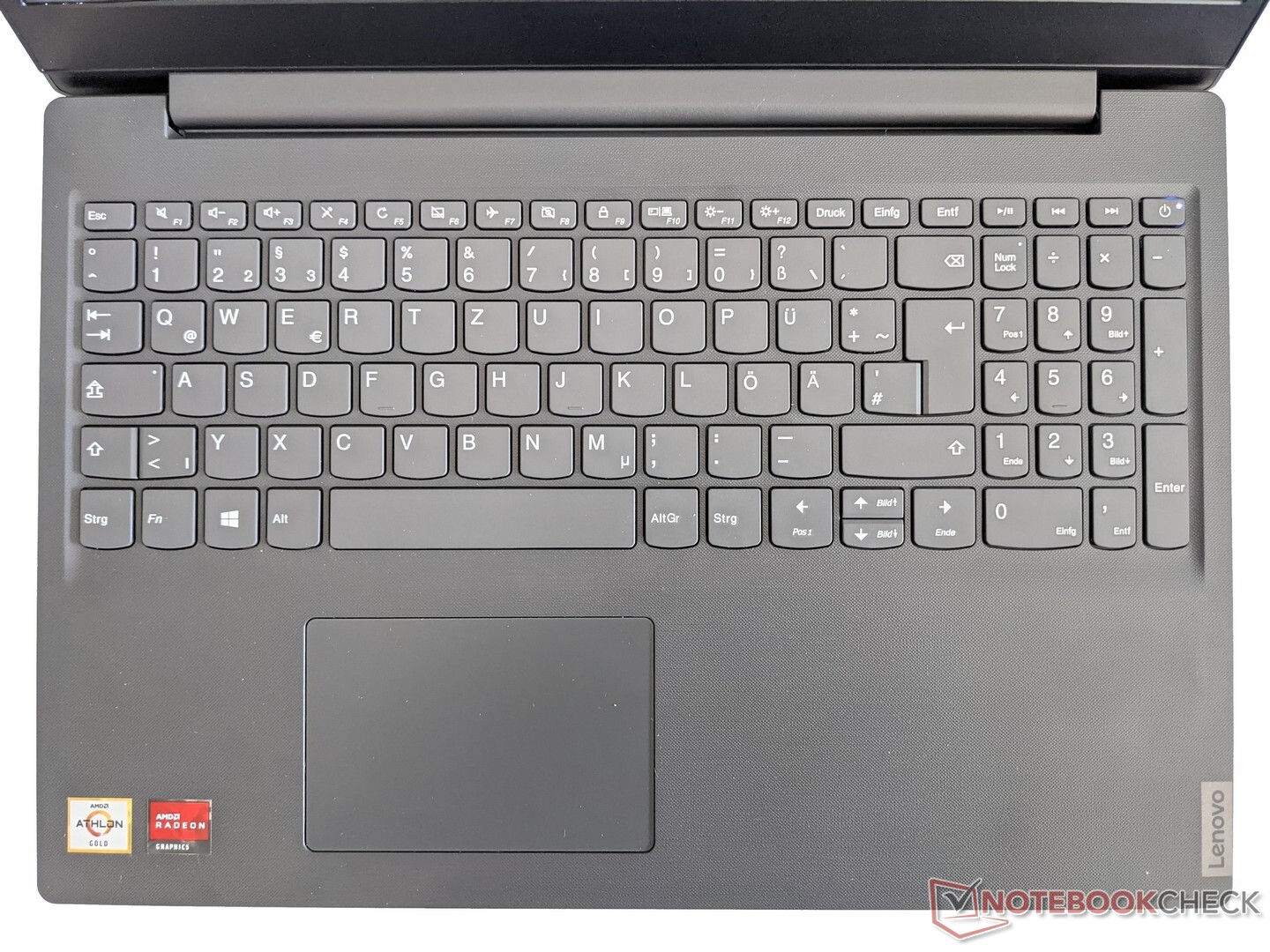 Die Tastatur des V15-ADA reicht nicht ganz an jene in Lenovos ThinkPad Modellen heran, bietet aber dennoch große Tasten und ein angenehmes Layout. Der Druckpunkt ist deutlich zu spüren und bietet beim Tippen nur einen geringen Widerstand. Schreibarbeiten gehen gut von der Hand, und Tasten wie "Einfg" und "Entf" sind nicht als Zweitbelegung untergebracht. Auf eine Beleuchtung wurde allerdings verzichtet.