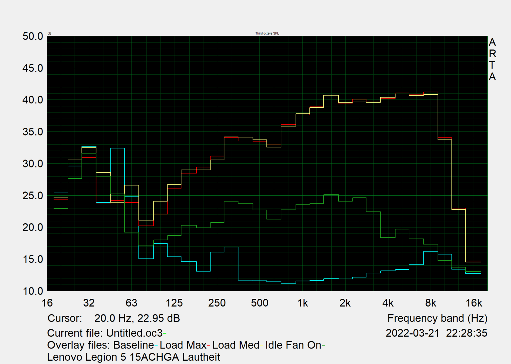 Im Modus "Beste Leistung" dreht der Lüfter erst bei kombinierter Last hörbar auf, wie etwa beim Zocken. Aber auch hier hält sich das Ganze mit maximal 34,5 dB in Grenzen, insbesondere subjektiv. Die Vergleichsgeräte werden deutlich lauter, bis auf das ExpertBook B1. Hochfrequente Töne oder Spulenfiepen wurden nicht festgestellt.