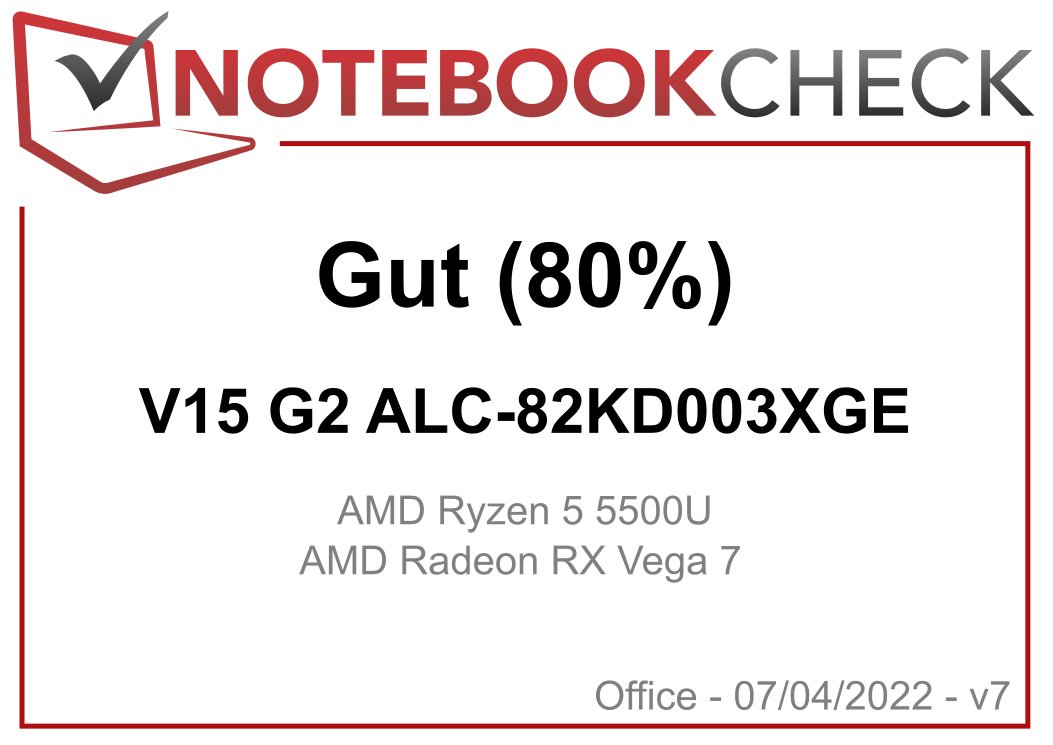 | 80 % v7 (old) | 04 / 2022 | Lenovo V15 G2 ALC-82KD003XGE R5 5500U, Vega 7 | 1.6 kg | 19.9 mm | 15.60" | 1920x1080 | |