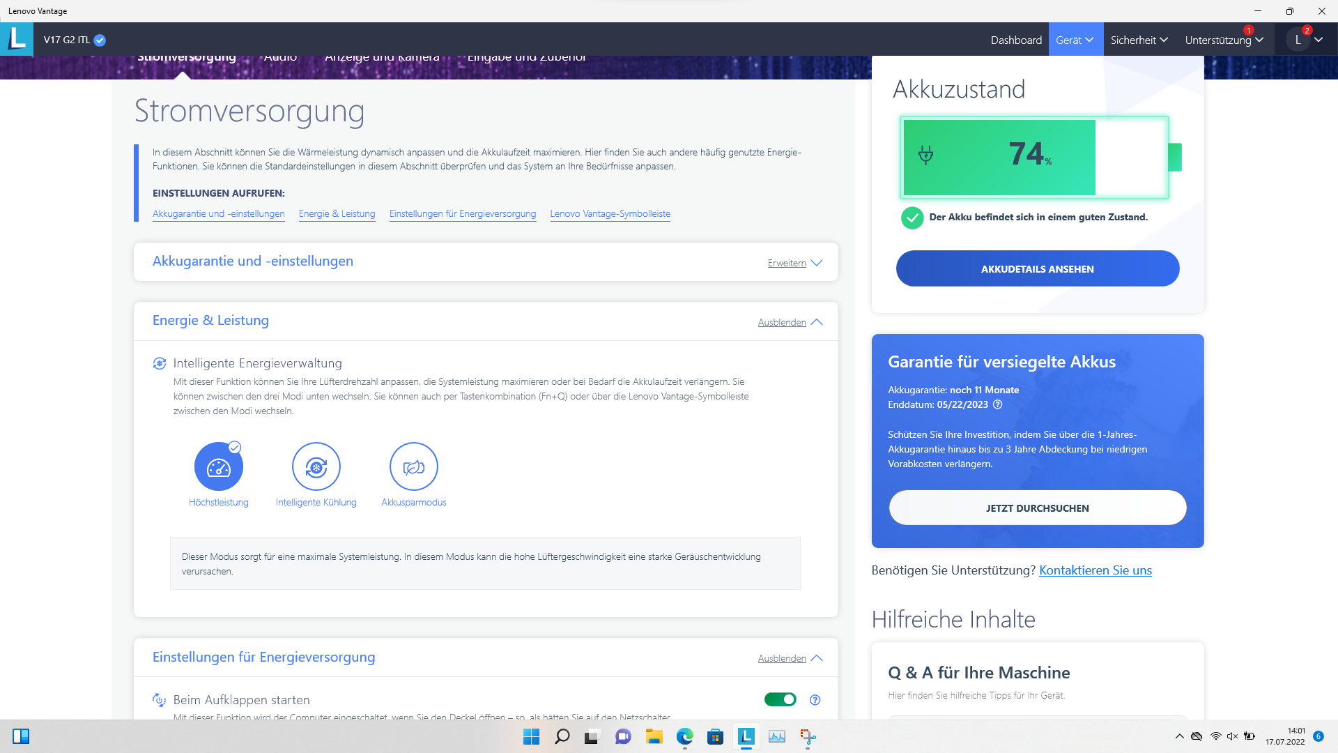 Lenovos Vantage-Software bietet 3 Leistungsmodi. Diese haben Auswirkungen auf die Power Limits und damit auf die (dauerhafte) Leistung. Die Lüfter drehen im sparsamsten Modus langsamer.