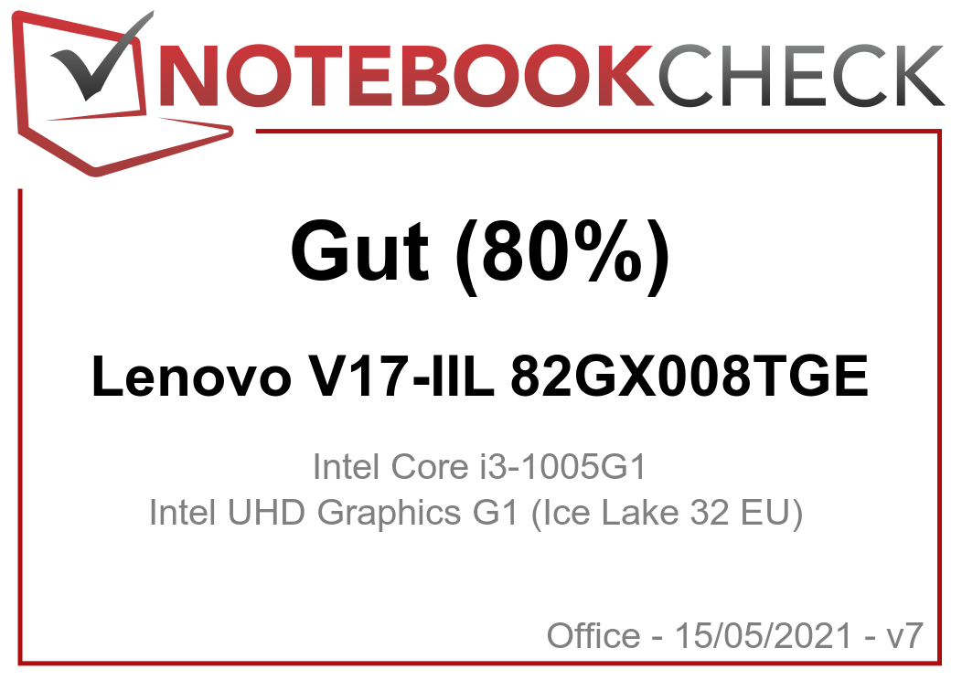 | 80 % v7 (old) | 05 / 2021 | Lenovo V17-IIL 82GX008TGE i3-1005G1, UHD Graphics G1 (Ice Lake 32 EU) | 2.2 kg | 19.9 mm | 17.30" | 1920x1080 | |