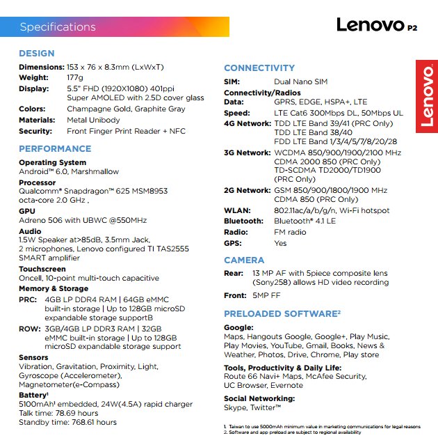 Diese Spezifikationen stammen aus einem auf Twitter veröffentlichten Specsheet zum Lenovo P2, wie Krispitech klarstellt. Das P2 dürfte also eindeutig die interessanteren Daten als das Moto M haben, sofern die bislang durchgesickerten Informationen zum Moto M korrekt sind. Das Lenovo P2 wird mit 5,5 Zoll Full-HD Super AMOLED-Display, dem 14 nm-Chip Snapdragon 625, 3 oder 4 GB RAM und 32 GB erweiterbarem Speicher ausgestattet sein. Ein 13 MP Sony IMX 258-Sensor sitzt auf der Rückseite, vorne gibt es 5 MP. Dank seines 5.100 mAh Akkus dürfte der Midranger ultralange Laufzeiten erreichen, ist aber mit 8,3 mm auch nicht der dünnste. Ob es am 8. November tatsächlich startet, ist bislang unbestätigt. Der Preis soll sich im Bereich zwischen 250 und 300 Euro bewegen.