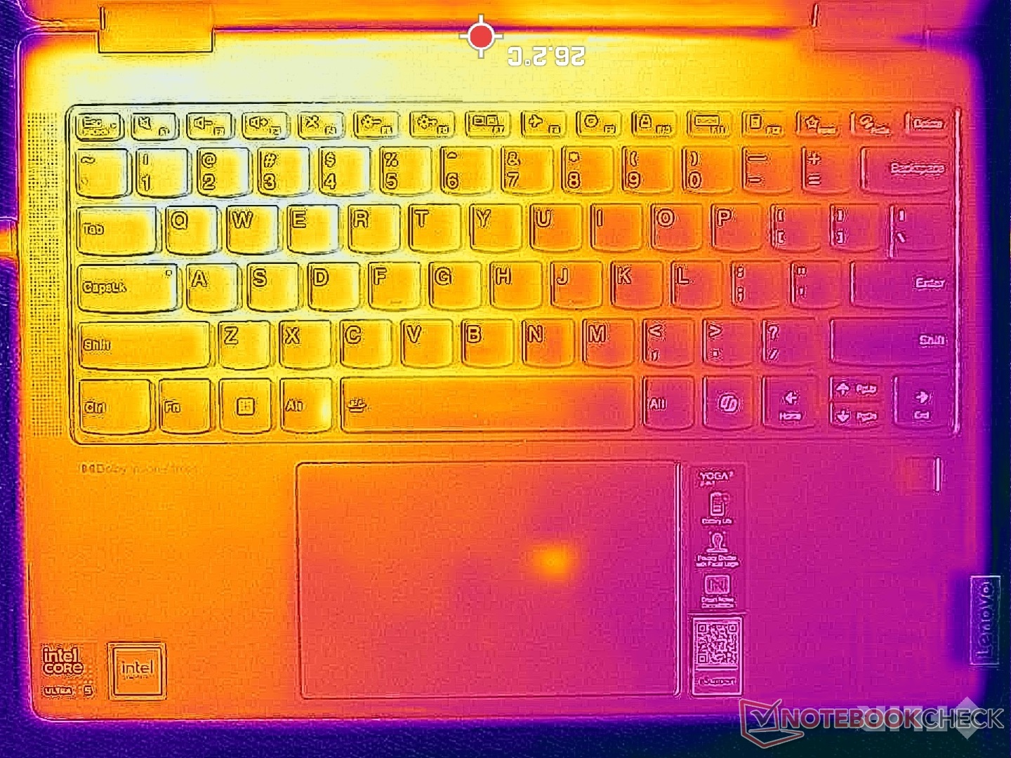 Die Oberflächentemperaturen sind auf der linken Hälfte des Gehäuses wärmer als auf der rechten, wobei die wärmsten und kältesten Bereiche 38 °C bzw. 27 °C erreichen. Der warme Bereich befindet sich leider in der Nähe der WASD-Tasten, was beim Spielen oder Tippen ungünstig ist. Im Vergleich dazu ist die wärmste Stelle des Dell Inspiron 14 7445 2-in-1 in der Nähe der Tastaturmitte, wo Handflächen und Finger nicht aufliegen. Trotzdem empfanden wir das Lenovo bei der Benutzung nie als unangenehm warm.
