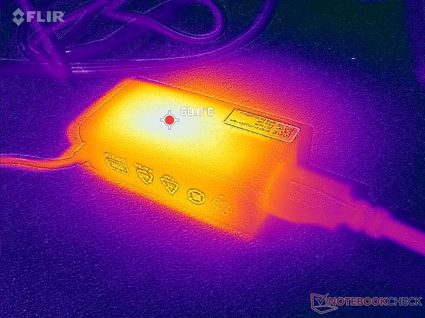 Mit dem kleinen (~9 x 4,7 x 2,7 cm) 65-W-USB-C-Netzteil konnten wir eine vorübergehende maximale Leistungsaufnahme von 65 W aufzeichnen, wenn die CPU zu 100 Prozent ausgelastet ist.