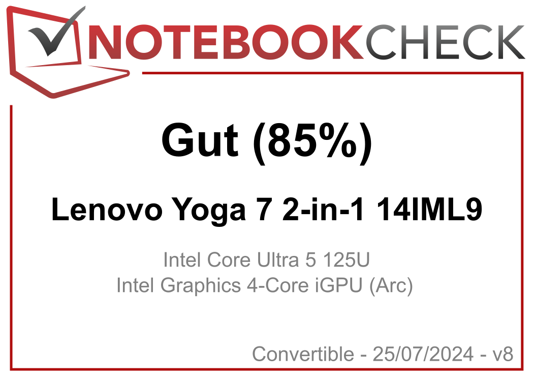 | 85.2 % | v8 | 07 / 2024 | Lenovo Yoga 7 2-in-1 14IML9 Ultra 5 125U, Graphics 4-Core iGPU (Arrow Lake) | 1.6 kg | 16.64 mm | 14.00" | 1920x1200 | |