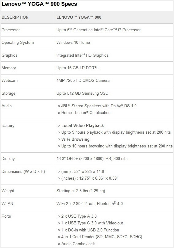 Zum weiteren Featureset des Yoga 900 zählen ferner integrierte JBL Stereolautsprecher, Wi-Fi 802.11 ac, Bluetooth 4.0, 2x USB 3.0, 1x USB 3.0 Typ-C, 1x DC-in mit USB-2.0-Funktion, 1x Sound-Kombibuchse und ein 4-in-1-Kartenleser (SD, MMC, SDXC, SDHC). Als OS ist Windows 10 Home vorinstalliert.