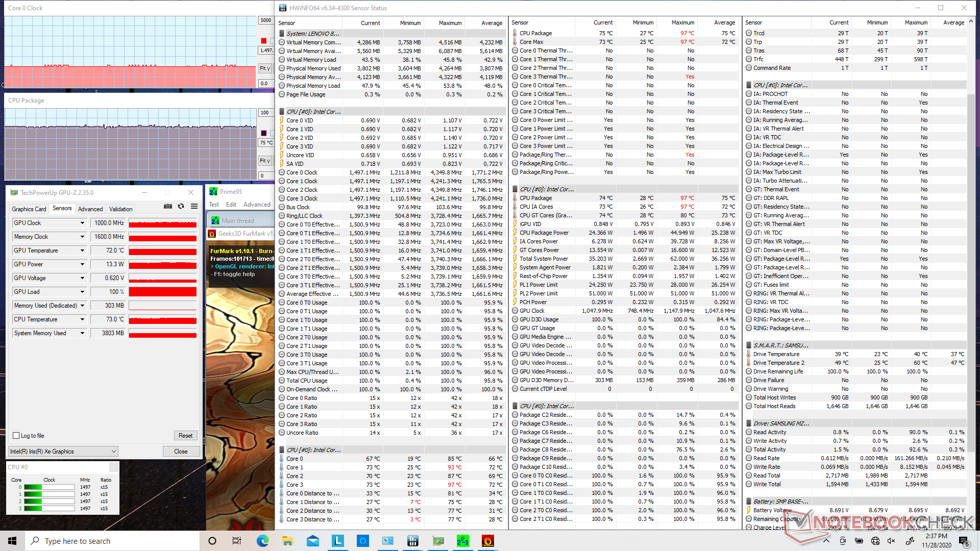 Bei der Ausführung von Prime95 steigt die CPU etwa 30 Sekunden lang auf 3,8 GHz und 96 °C an, bevor sie schließlich abfällt und sich bei 3 GHz und 83 °C stabilisiert. Im Vergleich dazu stabilisiert sich der Yoga 7i unter den gleichen Prime95-Bedingungen bei der gleichen Taktrate, aber etwas wärmeren 88 °C.