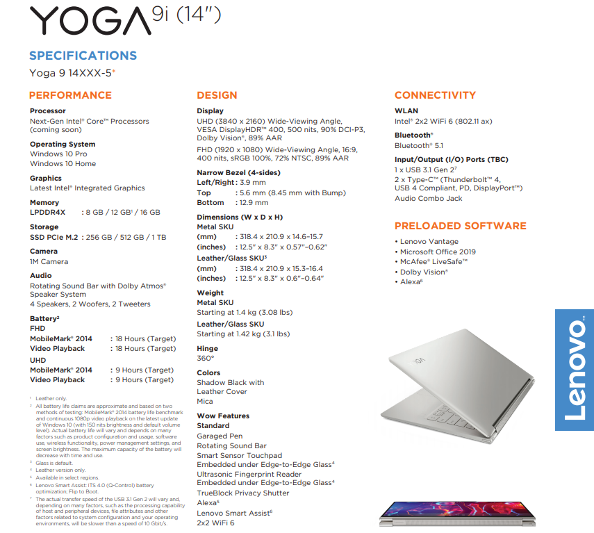 Auch wenn Lenovo es noch nicht sagen will: Das 14-Zoll-Modell wird durch die neuen Intel Tiger-Lake-CPUs angetrieben. Es gibt allerdings einige Spezifikationen, die nicht so recht zu einem High-End-Modell passen: Das Yoga 9i 14 ist auf 16 GB limitiert und es nutzt immer noch LCDs im 16:9-Format - anders als das Lenovo Yoga Slim 7 Pro.