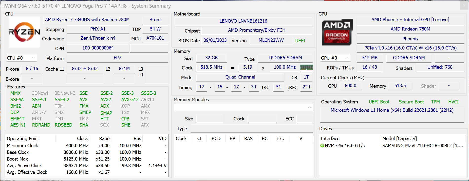 | 88.6 % v7 (old) | 12 / 2023 | Lenovo Yoga Pro 7 14APH G8 R7 7840HS, Radeon 780M | 1.5 kg | 15.6 mm | 14.50" | 2560x1600 | |