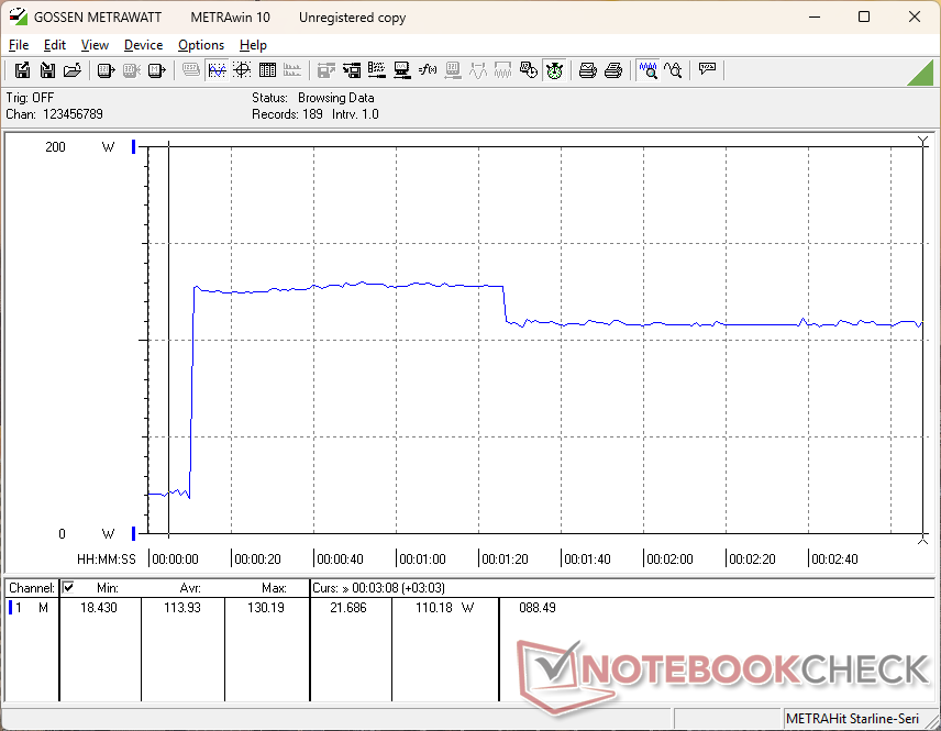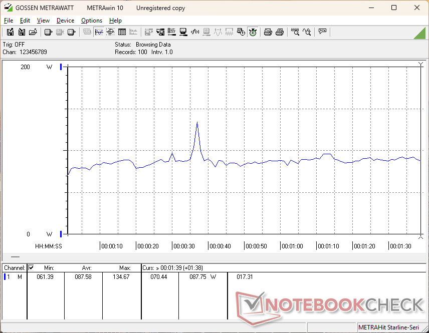 Der Verbrauch kann im iGPU-Modus bei minimaler Helligkeit des Bildschirms bis zu 7 W betragen und im dGPU-Modus bei maximaler Helligkeit über 22 W. Beim Spielen verbraucht das System jedoch nur ein paar Watt weniger als die viel schnelleren RTX-5060- oder -5070-Optionen. Ein Upgrade auf die RTX-5060-Konfiguration würde beispielsweise nur 6 % mehr Strom verbrauchen, aber 20 bis 30 % schnellere Gaming-Leistung bieten.