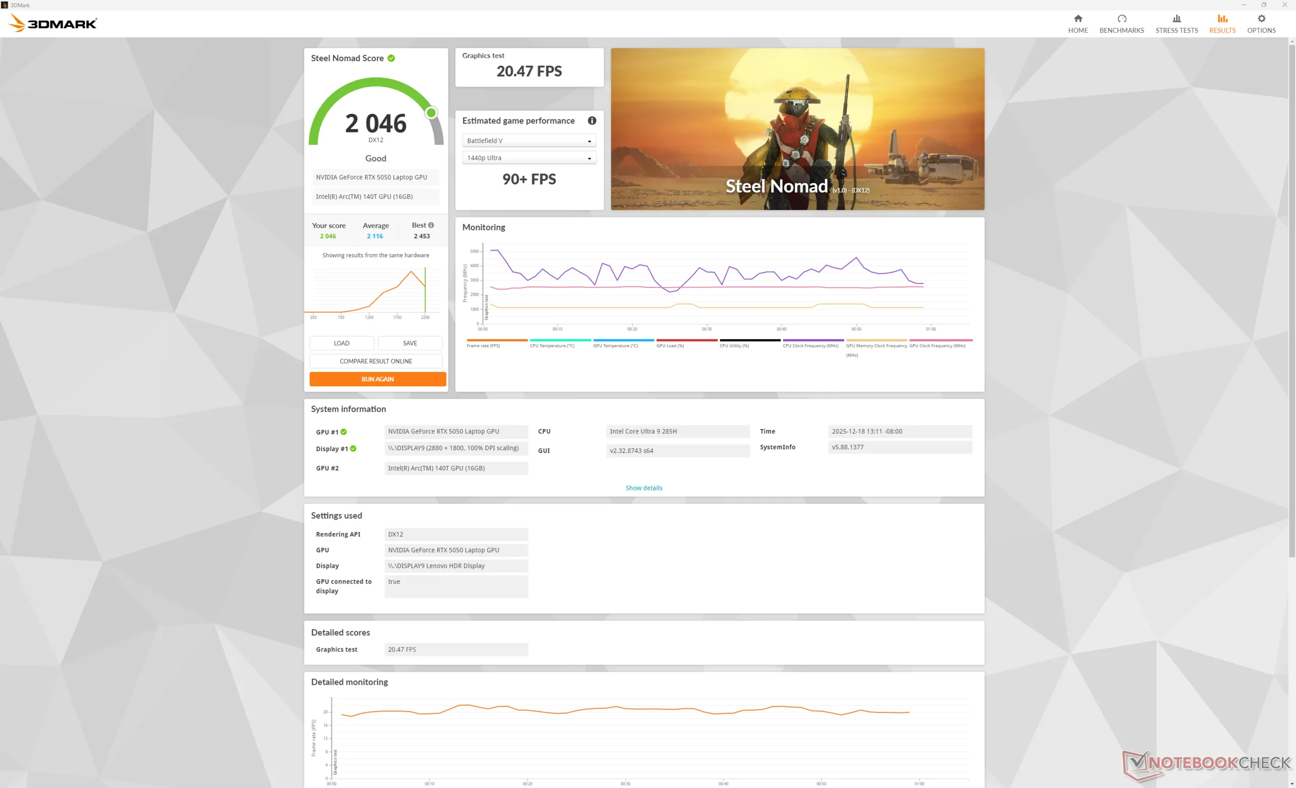 Noch schlimmer ist, dass die Entscheidung für die RTX-5050-Konfiguration nicht zwangsläufig zu längeren Akkulaufzeiten oder leiseren Lüftern beim Spielen oder bei hoher Last führt, obwohl die Leistung geringer ist. Der Core Ultra 9 285H bietet nicht einmal einen großen Vorteil gegenüber dem günstigeren Core Ultra 7 255H, aber SKUs mit der letztgenannten CPU sind in den USA leider schwieriger zu finden. Die Betriebstemperaturen mögen kühler sein, aber dieser leichte Vorteil verblasst im Vergleich zu der langen Liste von Nachteilen gegenüber der lohnenswerten RTX-5060-Option.