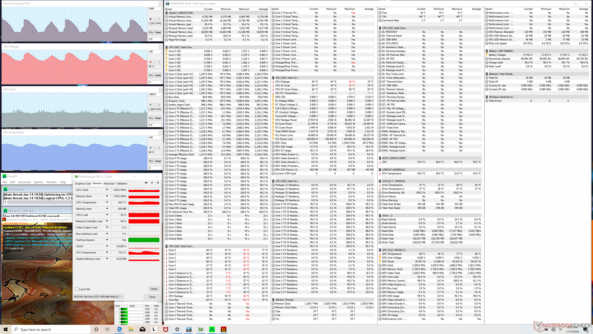 Wir versetzen den Laptop in eine synthetische Stresssituation, um mögliches Throttling oder Stabilitätsprobleme zu identifizieren. Läuft Prime95, steigt die Taktrate zu Beginn auf 4 GHz, fällt nach einigen Sekunden dann aber auf 3,2 - 3,3 GHz ab. Nach ein paar Minuten fällt sie weiter auf 2,9 - 3 GHz ab - die Kerntemperatur kann somit auf 87 °C gehalten werden. Laufen sowohl Prime95 als auch FurMark gleichzeitig, schwankt sowohl die Taktrate als auch die Temperatur der CPU und GPU endlos (siehe Screenshots und Tabelle).