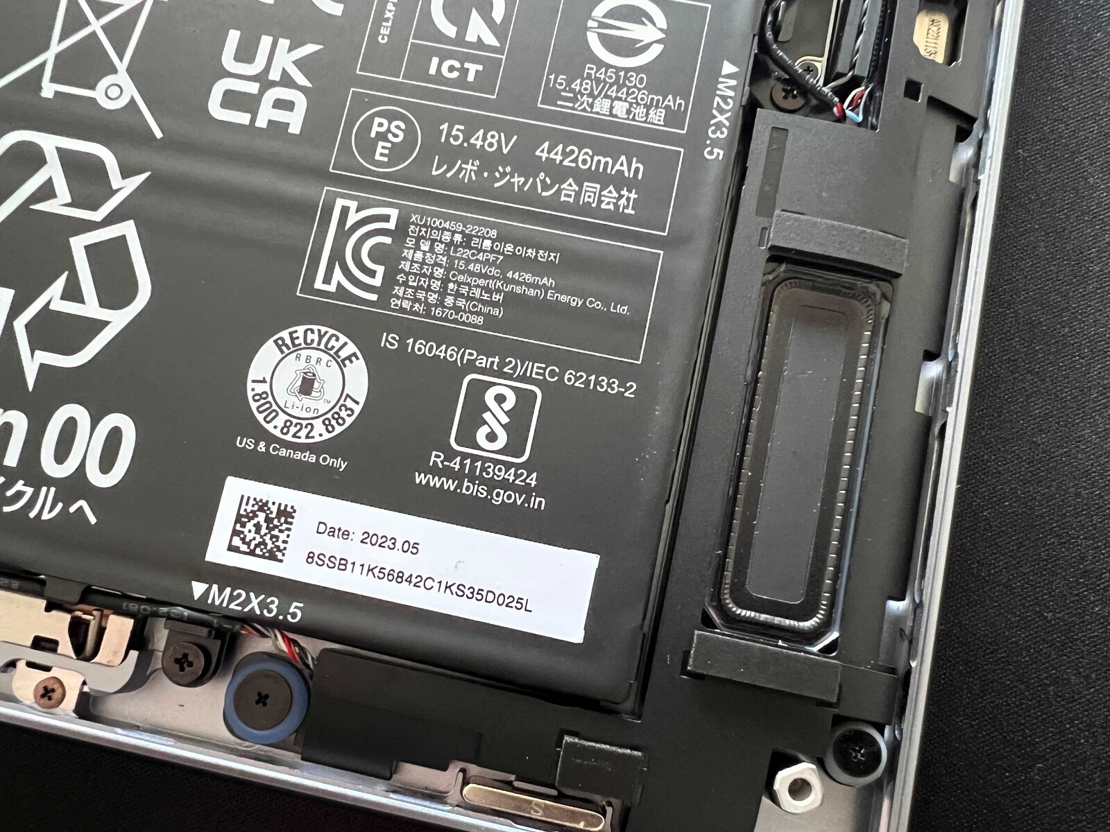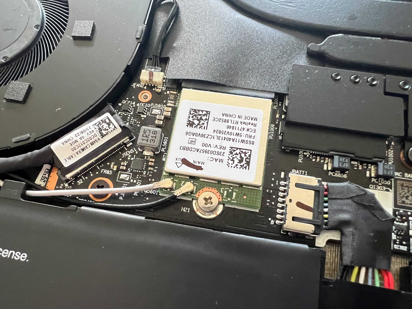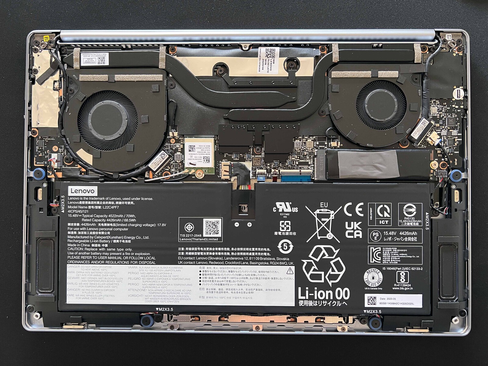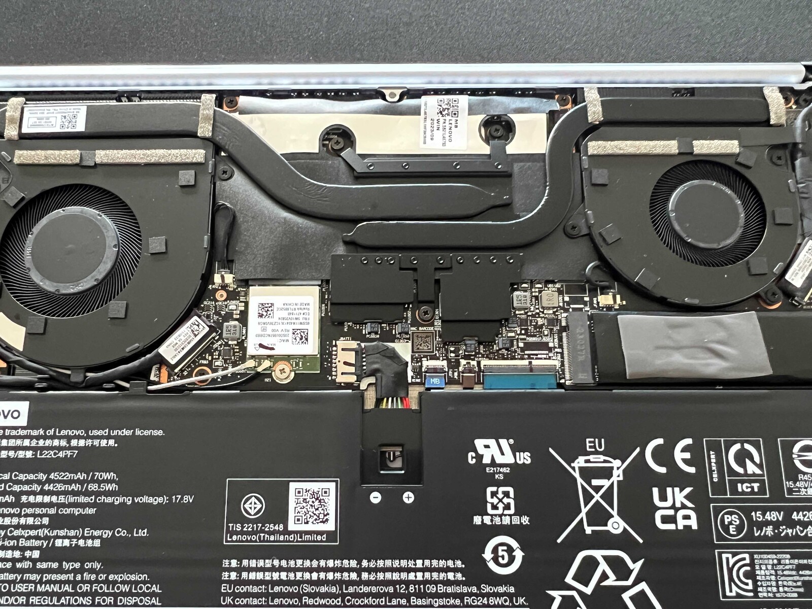 Die untere Abdeckung ist mit einen Torx-Schrauben (T5) sowie zusätzlichen Kunststoffclips und einer zusätzlichen Klammer gesichert, die sich in der Mitte des Gerätes befindet (das Gegenstück erkennt man im oberen mittleren Teil des Akkus). Daher ist es gar nicht so leicht, die Abdeckung zu entfernen. Viel zu tun gibt es dann im Inneren auch nicht, zumindest die Lüfter lassen sich reinigen und sowohl die M.2-2280-SSD als auch das WLAN-Modul können getauscht werden. Der Arbeitsspeicher und die anderen Komponenten sind aber aufgelötet.