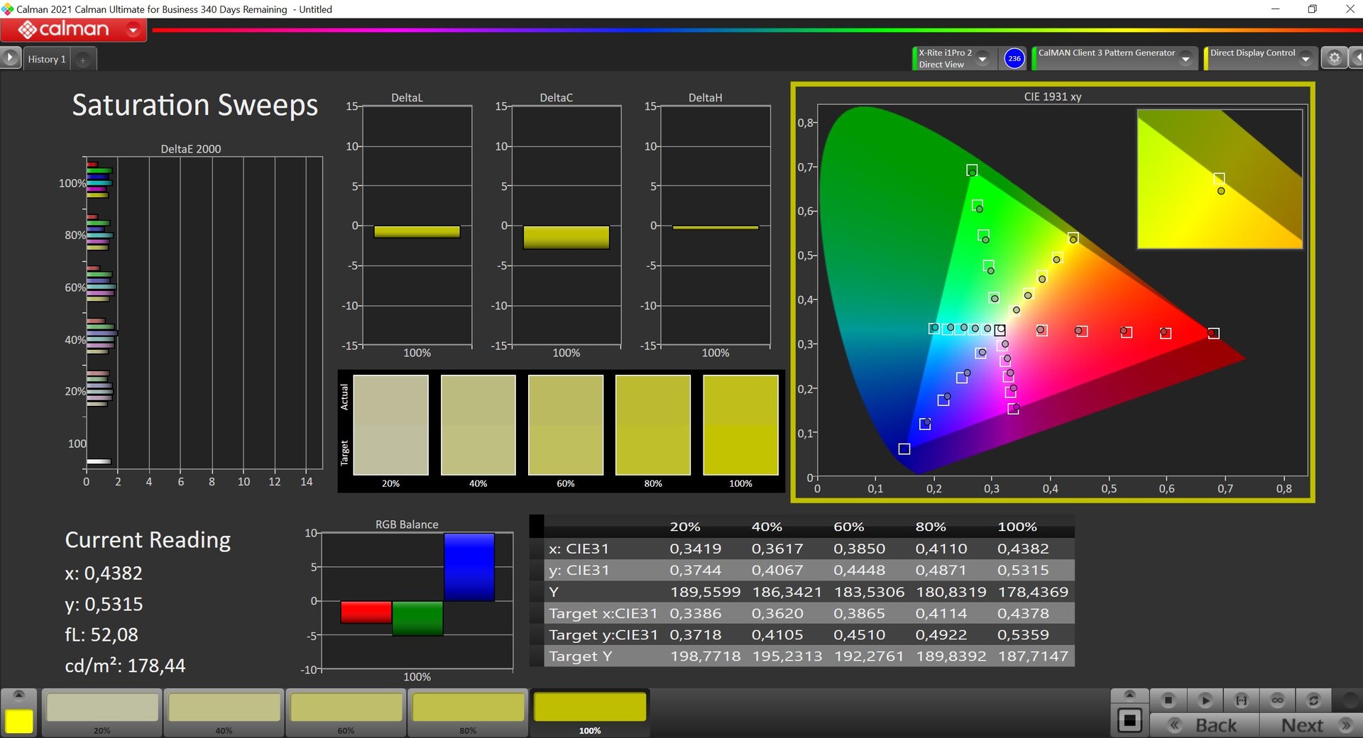 Für die Analyse des Panels verwenden wir die professionelle CalMAN-Software in Verbindung mit dem X-Rite i1 Pro 2 Spektralfotometer. Innerhalb der vorinstallierten Vantage-App stehen vier verschiedene Farbprofile zur Verfügung: Default, sRGB, P3 und AdobeRGB. Standardmäßig ist das Default-Profil aktiv, welches die Farben aber etwas übersättigt. Da das Display den P3-Farbraum abdecken soll, haben wir für unsere Bewertung auch das entsprechende Profil verwendet.