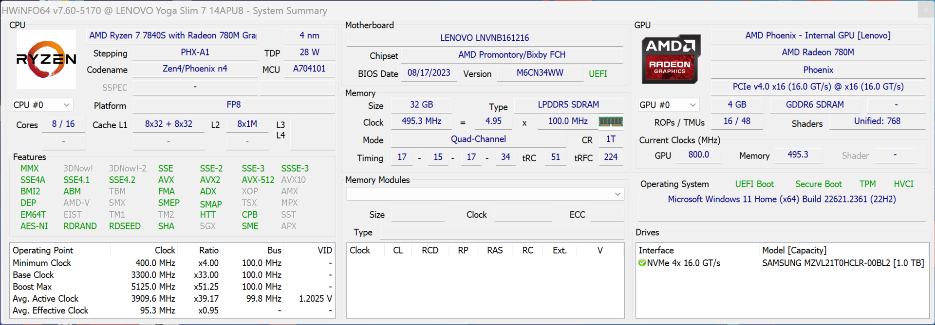Der Prozessor mit der Bezeichnung Ryzen 7 7840S kommt exklusiv in Lenovo-Laptops zum Einsatz, einen technischen Unterschied zum Ryzen 7 7840HS konnten wir aber nicht erkennen. Lediglich die minimale TDP kann Lenovo auch unter 35 Watt setzen und hat damit mehr Spielraum bei den Energieprofilen, was der Hersteller auch ausnutzt. Im Höchstleistungsmodus ist die Leistung auch sehr gut und gerade die Multi-Core-Leistung ist den aktuellen Intel-CPUs in diesem TDP-Bereich klar überlegen, doch ehrlicherweise muss man auch sagen, dass die Kühlung in dem dünnen Gehäuse mit diesem Prozessor eigentlich etwas überfordert ist. Wenn man die Leistung wirklich abruft wird es schnell laut und das Gehäuse wärmt sich stark auf. Im Alltag kann man dem mit den schwächeren Energieprofilen zwar entgegenwirken, alles in allem wäre ein U-Serie-Prozessor aber die bessere Wahl für die Kühlung gewesen.