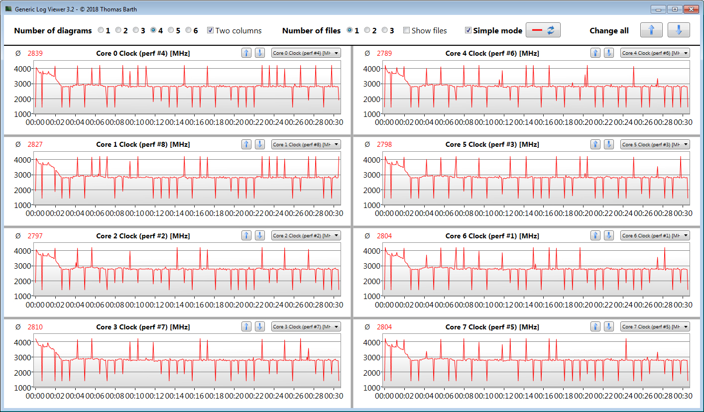 Die Multi-Thread-Tests der Cinebench-Benchmarks werden kurzzeitig mit 4 bis 4,1 GHz durchlaufen. Dann sinkt der Takt auf 3,7 bis 3,8 GHz. Im Akkubetrieb steigt der Takt von anfänglich 1,3 bis 2,5 GHz auf 3 bis 3,7 GHz. Die Single-Thread-Tests werden stets mit 1,4 bis 4,2 GHz bearbeitet.