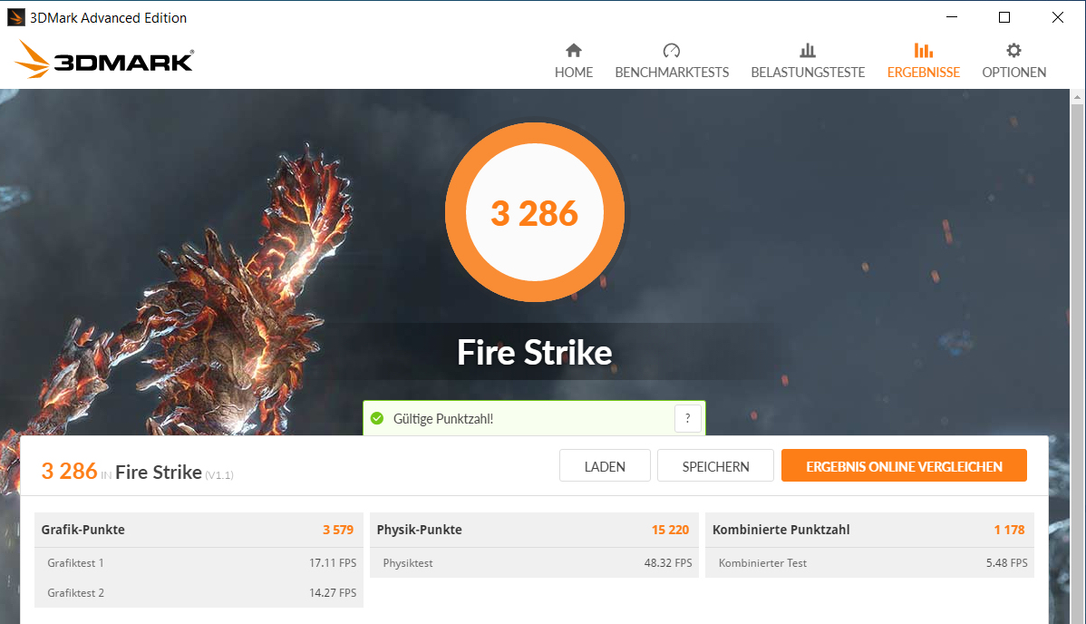 | 3DMark Fire Strike Score | 3286 Punkte | |
