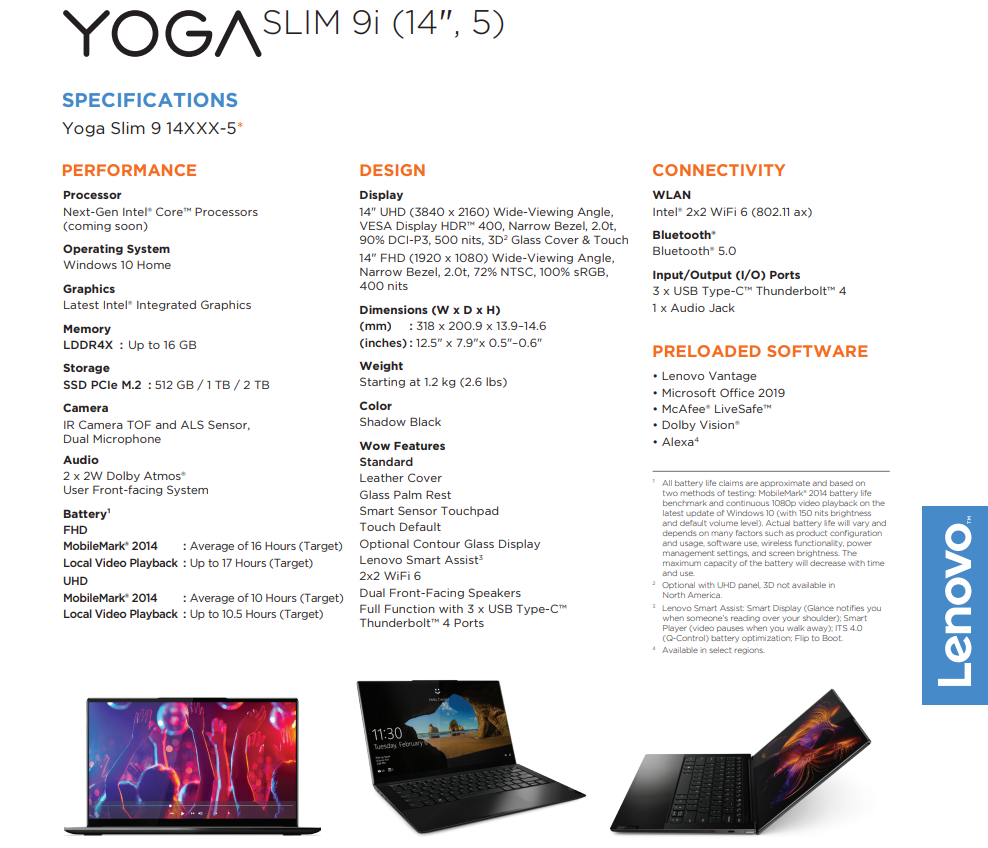 Das "i" im Namen ist schon ein Hinweis: Das Lenovo Yoga Slim 9i wird nur mit Intel-Prozessoren erhältlich sein. In diesem Fall heißt das immerhin: Tiger Lake, was im Datenblatt einfach nur "Next Gen Intel-CPUs" genannt wird. Die neuen Chips werden in Verbindung mit bis zu 16 GB verlöteten LPDDR4X-Speicher angeboten - 32 GB wären unseres Erachtens bei einem 2020er-Flaggschiff durchaus angemessen.