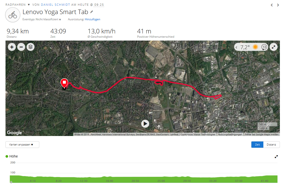 Auf unserer obligatorischen Fahrradtour zeigt sich das Yoga Smart Tab bei der Aufzeichnung der Strecke etwas genauer als unser Referenzgerät Garmin Edge 500. Auf langen Geraden sind die Abweichungen nur gering und auch Kurven sowie plötzliche Richtungswechsel werden gut mitgeschnitten. Daher ist das Lenovo-Tabelt gut für Navigationsaufgaben geeignet.