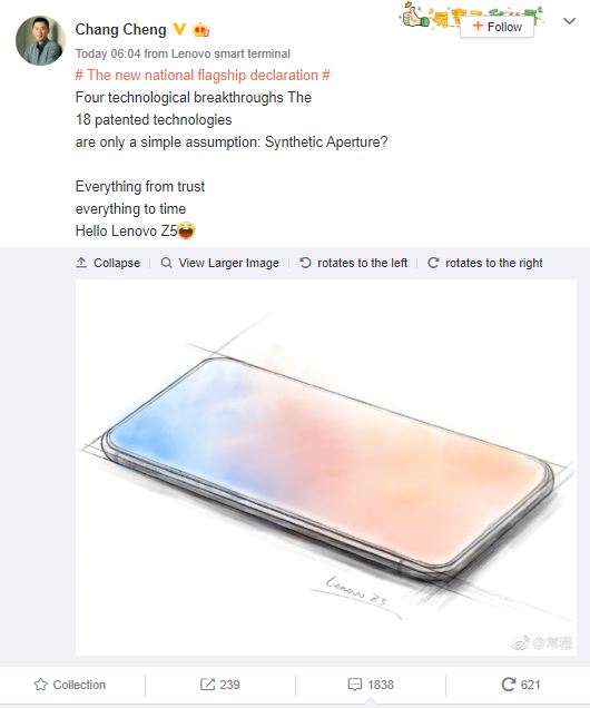 Letzte Woche teaserte der Vizepräsident des chinesischen Unternehmens einen Teil eines neuen Randlos-Phones, heute folgte dann der nächste Hinweis in Form einer Bezeichnung und eines gezeichneten Bildes. Der Name lautet Lenovo Z5 - wohlgemerkt nicht Moto Z5 - offensichtlich wird Lenovo am 14. Juni also eine neue Smartphone-Familie begründen und gleich mit dem ersten Modell Geschichte schreiben. Zumindest deuten Chengs Worte und das Bild doch auf eine kleine Revolution im Smartphone-Bereich.