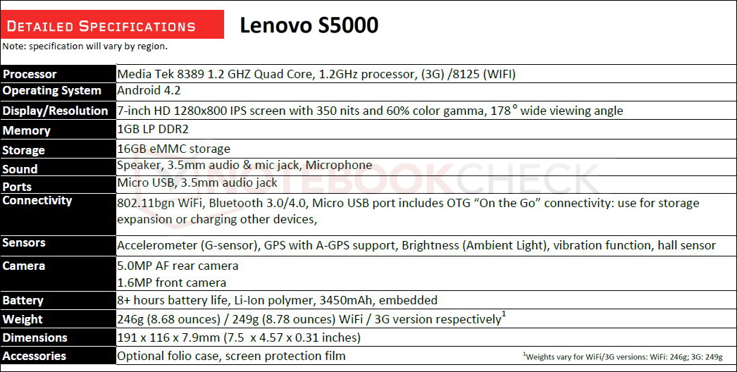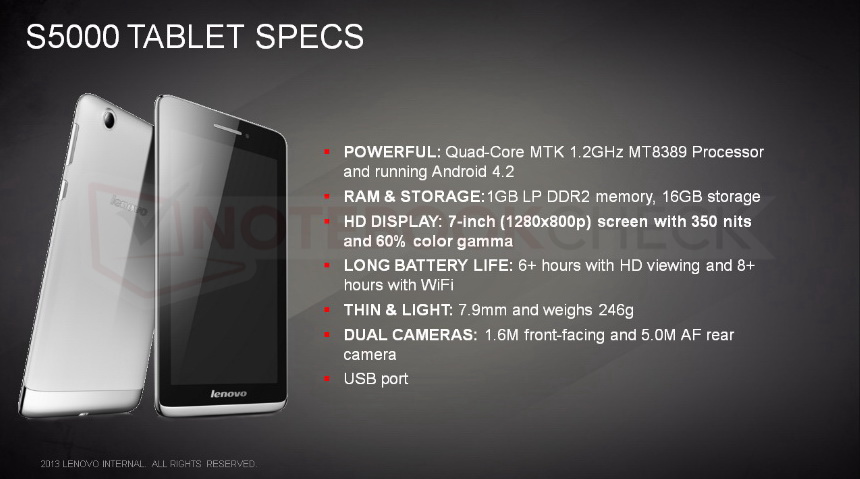 Der 7-Zoll-IPS-Touchscreen des S5000 soll eine Leuchtdichte von 350 cd/m² besitzen und mit einer Auflösung von 1.280 x 800 Pixeln anzeigen. Für den Speicher sieht Lenovo 1 GByte RAM und 16 GByte eMMC vor. Der Lithium-Polymer-Akku hat eine Kapazität von 3.450 mAh. Damit soll das S5000 bis zu 6 Stunden lang bei der Wiedergabe von HD-Videos durchhalten.