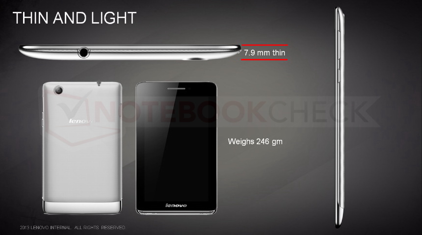 Das 7"-Android-Tablet S5000 von Lenovo ist 7,9 Millimeter flach und bringt als WLAN-Version rund 246 Gramm (3G-Modell: 249 g) auf die Waage. Der Chipsatz stammt ebenfalls von MediaTek und ist beim 3G/UMTS-Modell ein MT8389 Quad-Core (1,2 GHz) und bei der WLAN-Version der gleich schnell getaktete MT8125. Android ist auf dem Tablet in Version 4.2 Jelly Bean installiert.