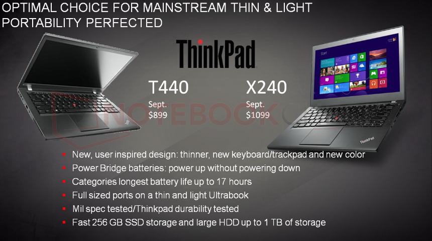 Die Ultrabooks ThinkPad T440, T440s und X240 kommen laut Lenovo mit einem bis zu 20 Prozent flacheren Gehäuse als bisherige Lenovo-Ultrabooks, unterschiedlichen Display-Optionen und bis zu 45 Prozent größeren und für Windows-8-Gesten optimierten Touchpads daher. Zudem sollen die neuen Serien dank der Power-Bridge-Akkutechnik und Hot Swap eine Batterielaufzeit von bis zu 17 Stunden bieten. Das funktioniert laut Lenovo mit den Akkus ThinkPad 68 (23,5 Wh), 68+ (72 Wh) und den 48-Wh-Batterien.
