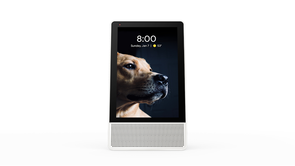 with just his voice. Available in both 8-inch and 10-inch models, the Lenovo Smart Display rotates from