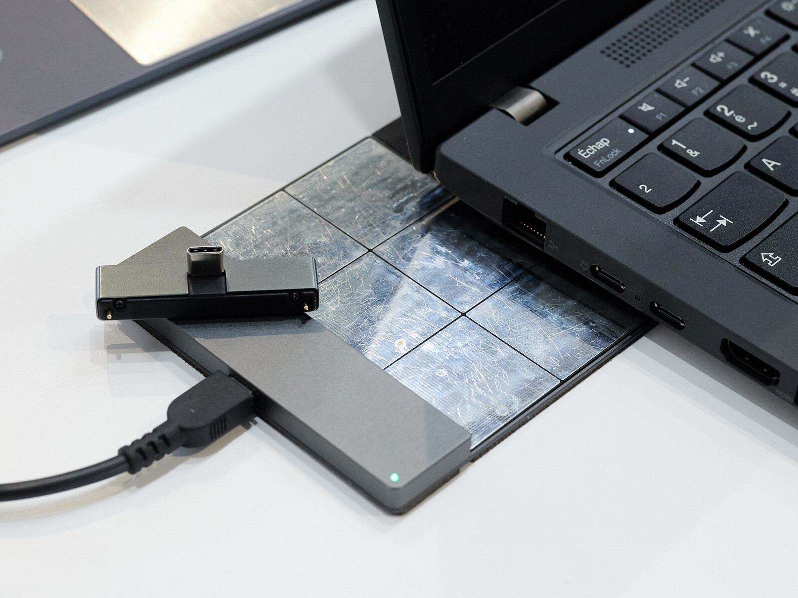 Seitens Energysquare ist außerdem eine Erweiterung des Aufladesystems vorgesehen. Auf der Computex zeigte der Hersteller einen Adapter, der seitlich in einen USB-C-Port eines Notebooks eingesteckt wird. Damit werden die beiden Pins mit weniger Aufwand nach unten geführt. Das alte System für Notebooks war recht klobig.