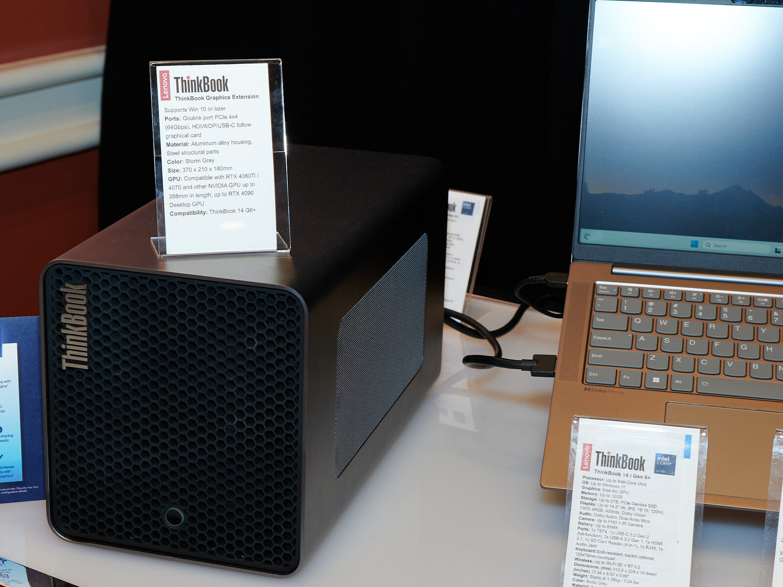 Aber selbst innerhalb des eGPU-Segments ist Lenovo inkonsequent. Im Gespräch vor Ort gab Lenovo an, dass das eGPU-Gehäuse vor allem für professionelle Grafikkarten gedacht ist. Doch initial wird das eGPU-Gehäuse zumindest nur in den USA Bundle mit dem Thinkbook 14 i verkauft. Eine Grafikkarte wird dabei im Preis von rund 2.200 US-Dollar (netto) enthalten sein. Doch das ist nicht etwa eine Profikarte, sondern eine RTX4070. Damit wird das Thinkbook 14 i auch für Gamer interessant, aber das Profisegment müsste die Grafikkarte im eGPU-Gehäuse erst einmal austauschen.