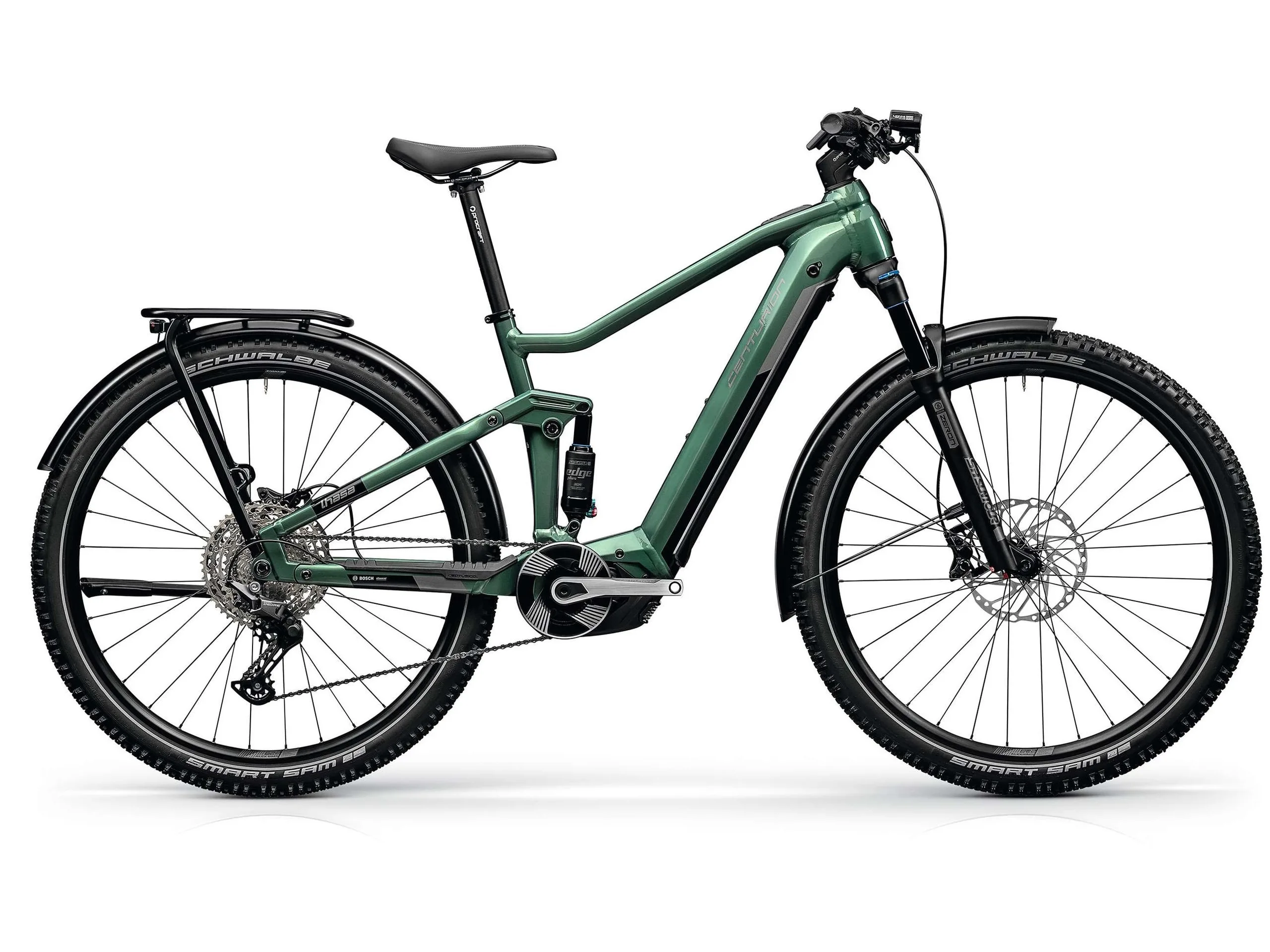 Das Lhasa R800i EQ von Centurion ist ein neues SUV-Bike mit Elektromotor. Als SUV-Bike wie etwa das Carver SUV E.510 FS bezeichnet man damit im Regelfall ein vollgefedertes Fahrrad mit einer umfangreichen, einem Trekking-Fahrrad entsprechenden Ausstattung. Dementsprechend bringt das Lhasa R800i EQ nicht nur Schutzbleche mit, sondern auch einen Gepäckträger und eine Beleuchtung. Der Gepäckträger ist zum Snapit 2.0-System kompatibel, damit lassen sich etwa auch Körbe einfach befestigten. Der Frontscheinwerfer soll es auf 210 Lumen bringen.
