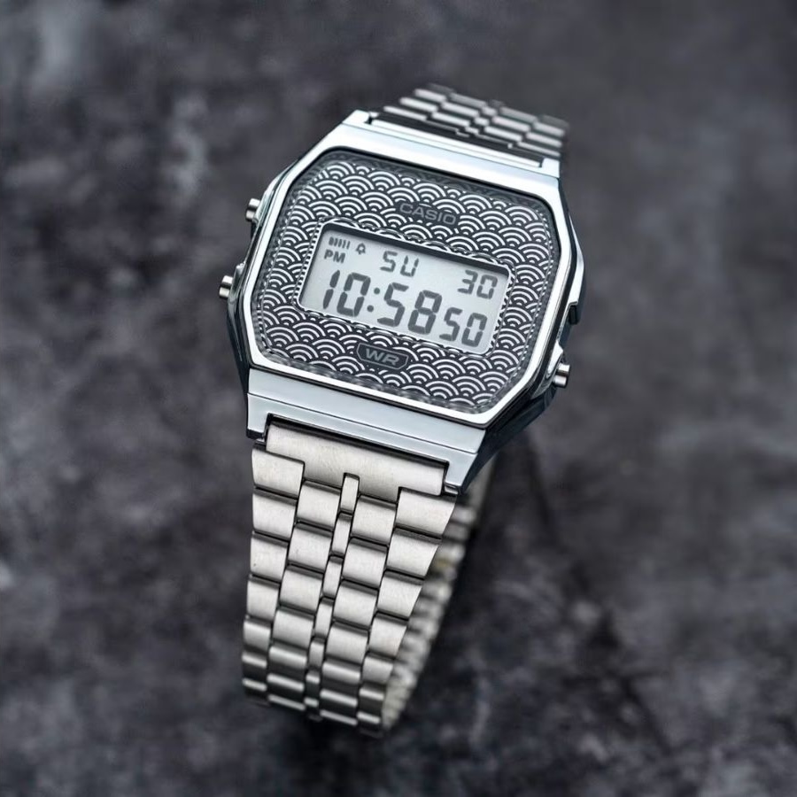 Die A159WEVJ-2 verfügt über ein blaues Zifferblatt mit Seigaiha-Wellenmuster, während die A159WEVJ-7 das gleiche Design in Silber zeigt. Beide Varianten besitzen ein silberfarbenes, verchromtes Harzgehäuse samt Lünette sowie ein passendes Edelstahlarmband. Das Display ist hell gehalten und kombiniert dies mit dunklen Ziffern für gute Ablesbarkeit.