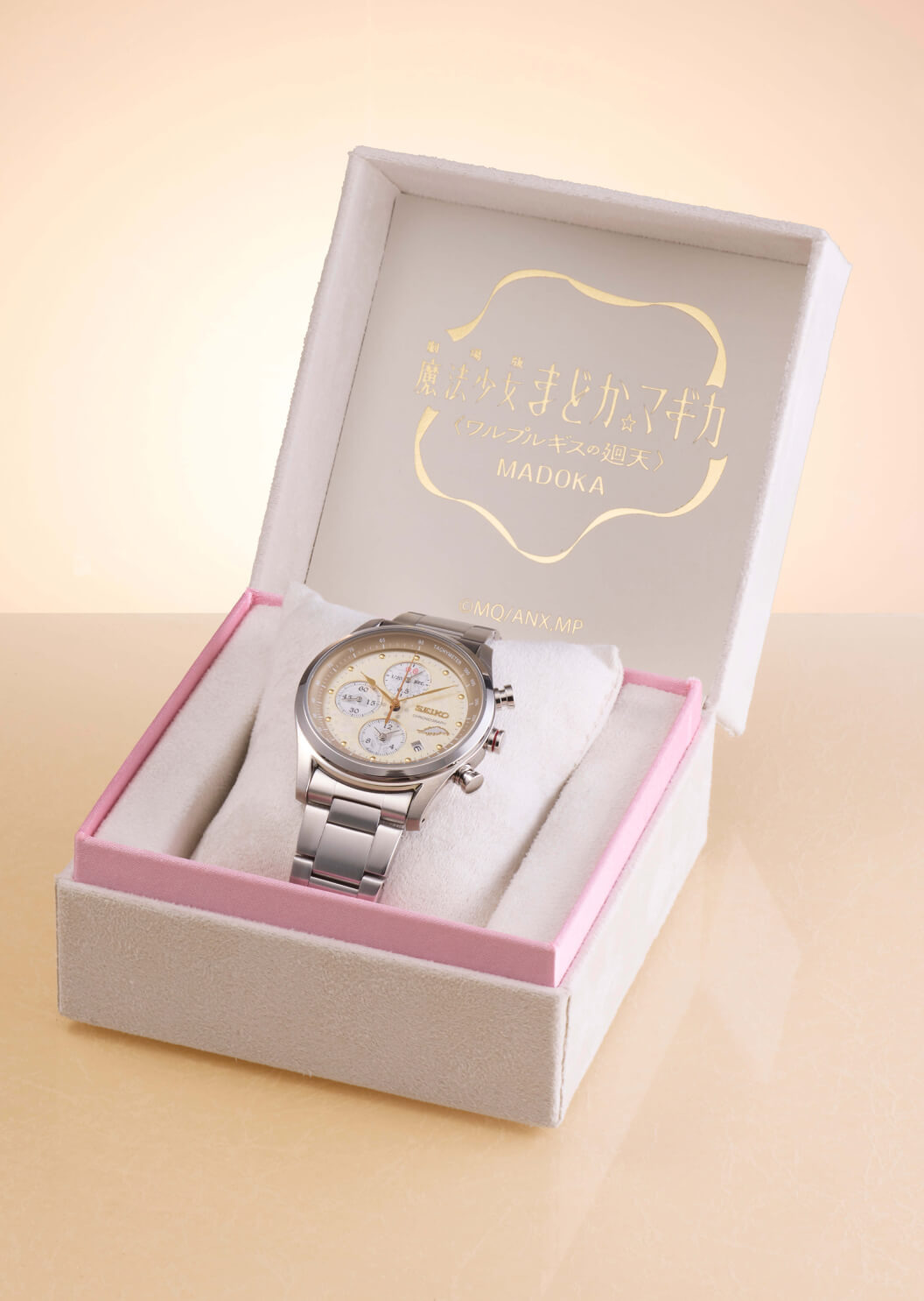 Die Zusammenarbeit umfasst zwei verschiedene Referenzen. Das Madoka-Modell (NEODAI-286770) verfügt über ein Zifferblatt in blassem Champagnergold, das in einem Gehäuse aus gebürstetem Edelstahl untergebracht ist. Zarte rosa Akzente und Hilfszifferblätter, deren Design an die Bänder aus Madokas Verwandlungsszene erinnert, schmücken das Zifferblatt.
