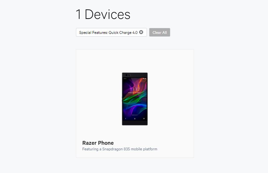 Das Ausmaß der Tragödie wird sichtbar, wenn man auf der Qualcomm-Seite die verfügbaren Smartphones nach speziellen Features filtert und dort Quick Charge 4.0 auswählt. Die Suche spuckt gerade mal ein einziges Smartphone aus, das im Vorjahr vorgestellte Razer Phone. Ganz korrekt ist die Suche allerdings nicht, denn das Nubia Z17 vom chinesischen Hersteller ZTE unterstützt Quick Charge 4.0 ebenfalls, wenngleich zumindest zum Launch kein Quick Charge 4-kompatibles Netzteil beilag.