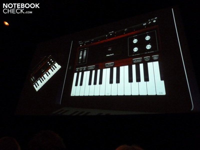 - zweite App: "Garage Band" für iPad, ermöglicht das virtuelle Spielen zahlreicher Instrumente am iPad, Synthesizer, Position als auch die Druckfestigkeit der einzelnen Finger wird beim Spielen registriert, Gitarre, Drums, Klavier uvm. möglich, auch der Anschluss eigener Instrumente wird möglich sein, Preis der Apps: 4.99 US-Dollar, ab 11. März im App-Store