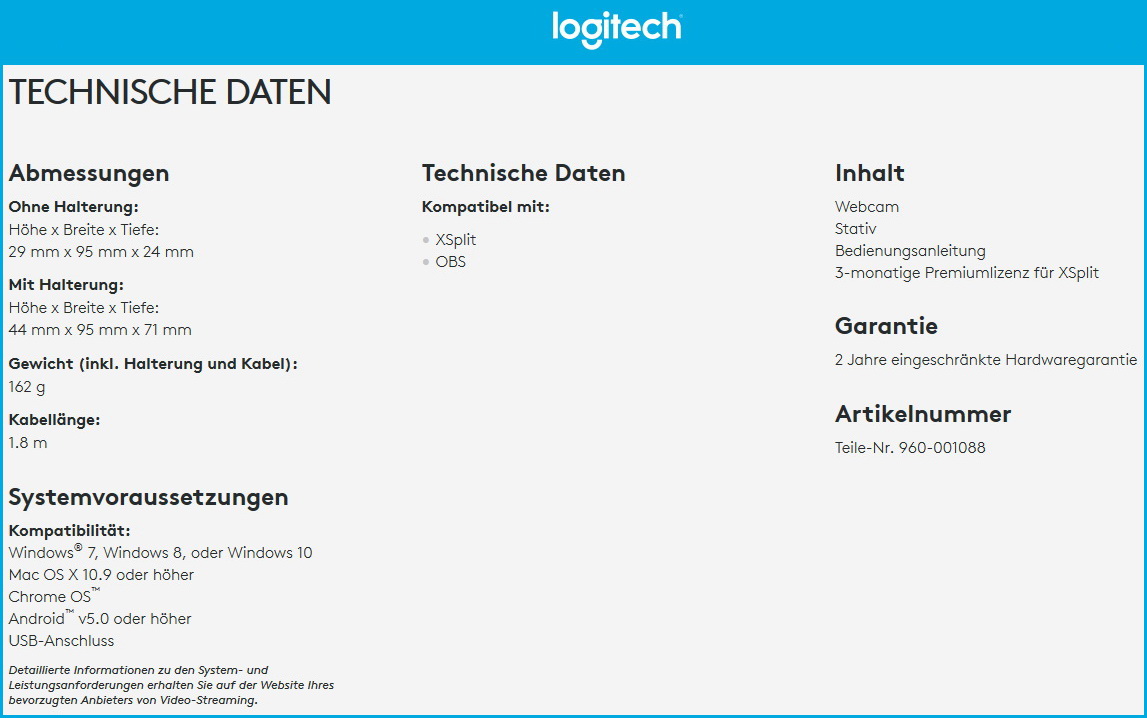 Für den Austausch des Hintergrunds enthält das Webcam-Paket eine Software von Personify, sowie eine Aufnahme- und Streaming-Lizenz von XSplit für 3 Monate. Außerdem ist im Lieferumfang ein Tripod mit Schwenkkopf enthalten, der eine individuelle Positionierung der C922 Pro Stream Webcam ermöglicht.