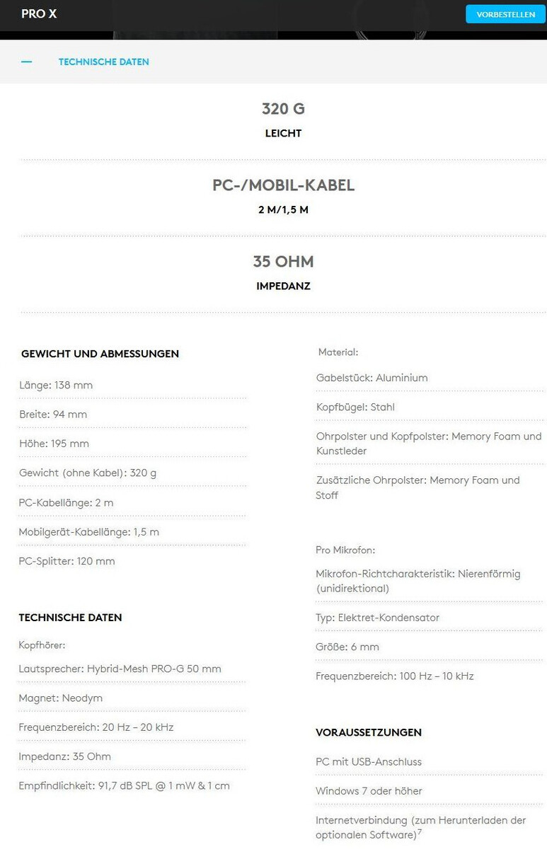 Dem G Pro X Gaming-Headset spendiert Logitech neben dem PC-Kabel mit integrierter Audiosteuerung auch ein zusätzliches mobiles Kabel mit Mikrofon in der Strippe, womit sich der Pro X mit abgenommenem Bügelmikrofon unterwegs als Kopfhörer verwenden lässt. Eine mitgelieferte Tragetasche schützt das Pro X-Headset und das Zubehör auf Reisen. Logitech nennt für beide Gaming-Headsets der G Pro-Serie ein Gewicht von jeweils 320 Gramm und Frequenzgänge von 20 Hz bis 20 kHz für die Lautsprecher sowie 100 Hz bis 10 kHz fürs Mikrofon.