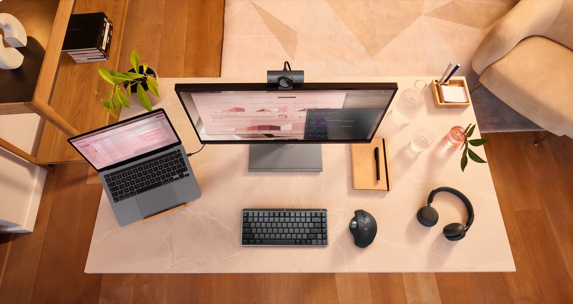Die Logitech MX Brio kann wahlweise auf einen Monitor geklemmt oder mittels Stativgewinde montiert werden. In jedem Fall erlaubt es die Halterung, die Kamera nach unten zu klappen, um die Schreibtisch-Oberfläche zu zeigen. Zwei Beamforming-Mikrofone mit Geräuschunterdrückung versprechen passablen Sound. Eine Objektiv-Abdeckung soll die Privatsphäre des Nutzers schützen, während die Webcam nicht verwendet wird. Der Anschluss an den Computer erfolgt über ein USB-C-Kabel, wobei die Webcam sowohl mit Windows als auch mit macOS, ChromeOS und Linux kompatibel ist.