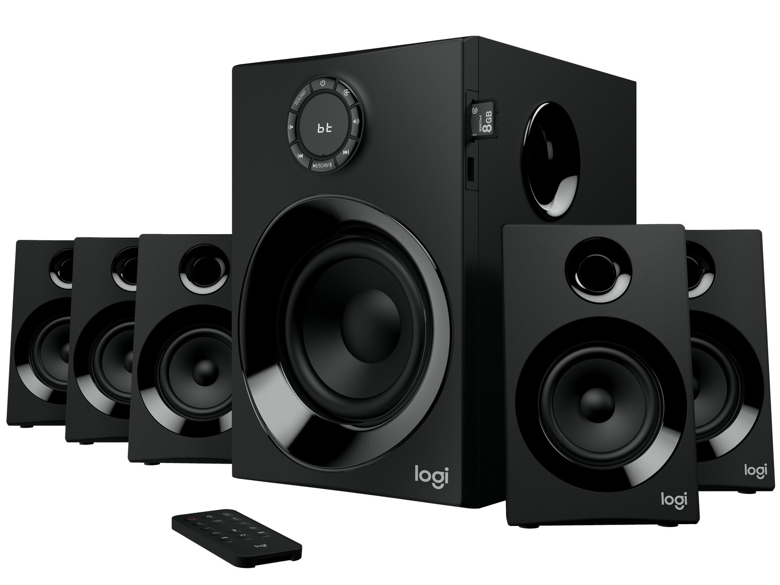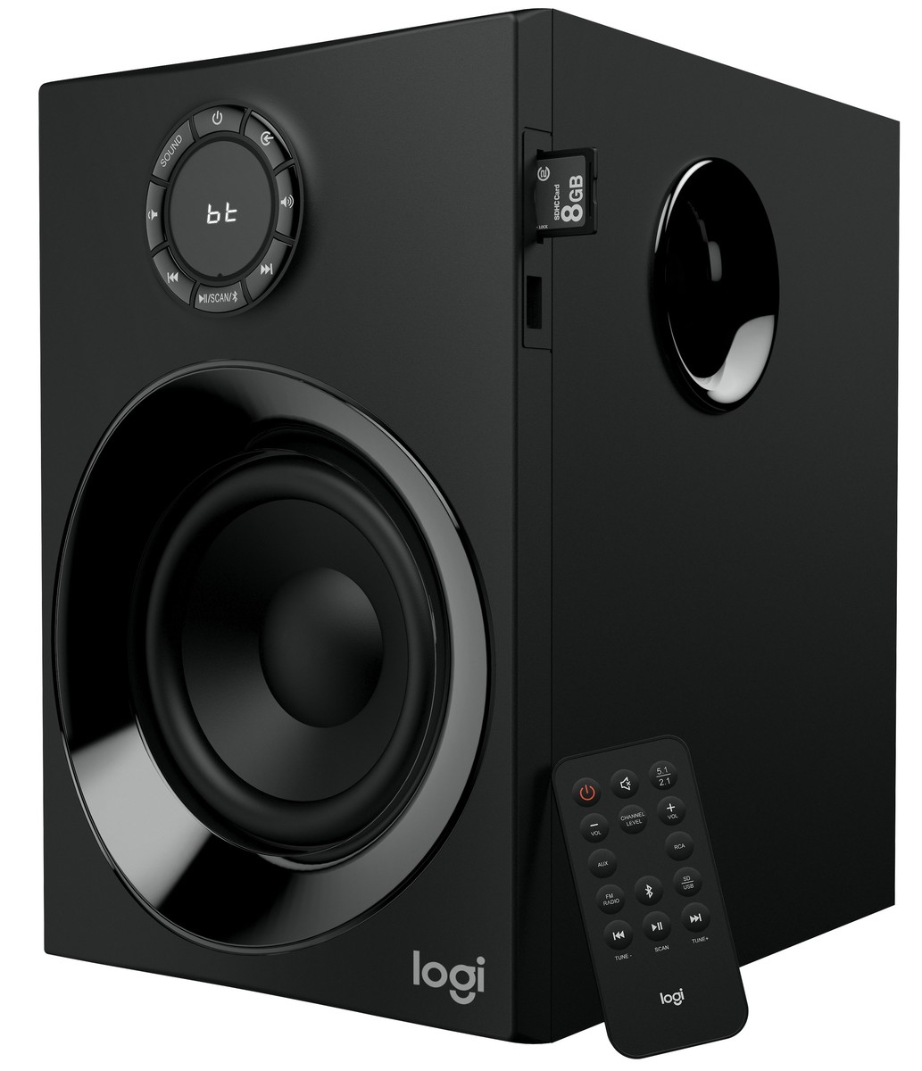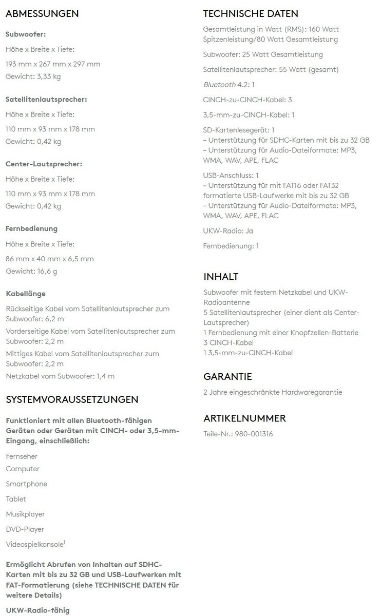Für kräftigen Sound sorgen 5 Satellitenlautsprecher und ein 5,25-Zoll-Subwoofer mit einer Gesamtspitzenleistung von 160 Watt. Mit der kompakten Fernbedienung lassen sich bei Logitechs Z607 Surround-Sound-System alle Funktionen wie Wiedergabe, Lautstärke, Input-Quellenwahl, Radiostationen und mehr steuern. Unterstützt werden vom Z607 Lautsprechersystem Bluetooth 4.2, SDHC-Karten mit bis zu 32 GB sowie USB-Speicher mit bis zu 32 GB (FAT16/32). Neben 3 Cinch-Kabeln liefert Logitech auch ein 3,5-mm-auf-Cinch-Adapterkabel mit.