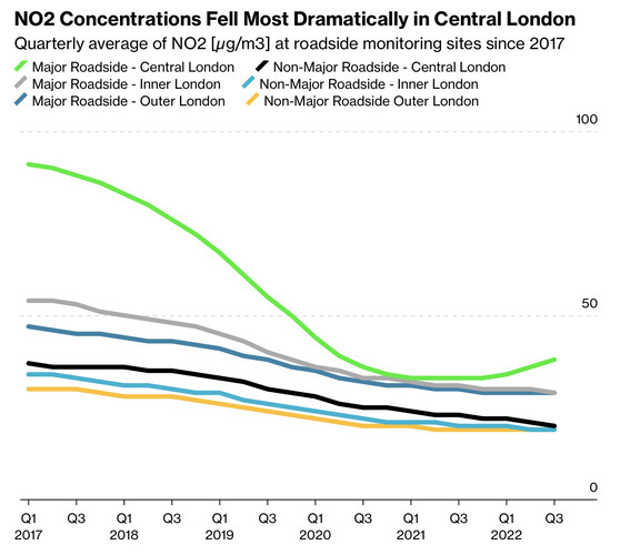 Die neuen Abgaben zielen insbesondere auf Dieselfahrzeuge ab, die häufig schädlichere Konzentrationen von Stickstoffdioxid (NO2) ausstoßen als Fahrzeuge mit Benzinmotor. Seit 2017 ist ein Rückgang der NO2-Belastung zu beobachten, der neben der Ausweitung der ULEZ auch auf eine Zunahme von Elektrofahrzeugen, aber auch von emissionsärmeren Fahrzeugen mit Verbrennungsmotor zurückzuführen ist. So stieg die Zahl der Elektrofahrzeuge von weniger als 3.000 vor zehn Jahren auf fast 75.000 im ersten Quartal dieses Jahres.