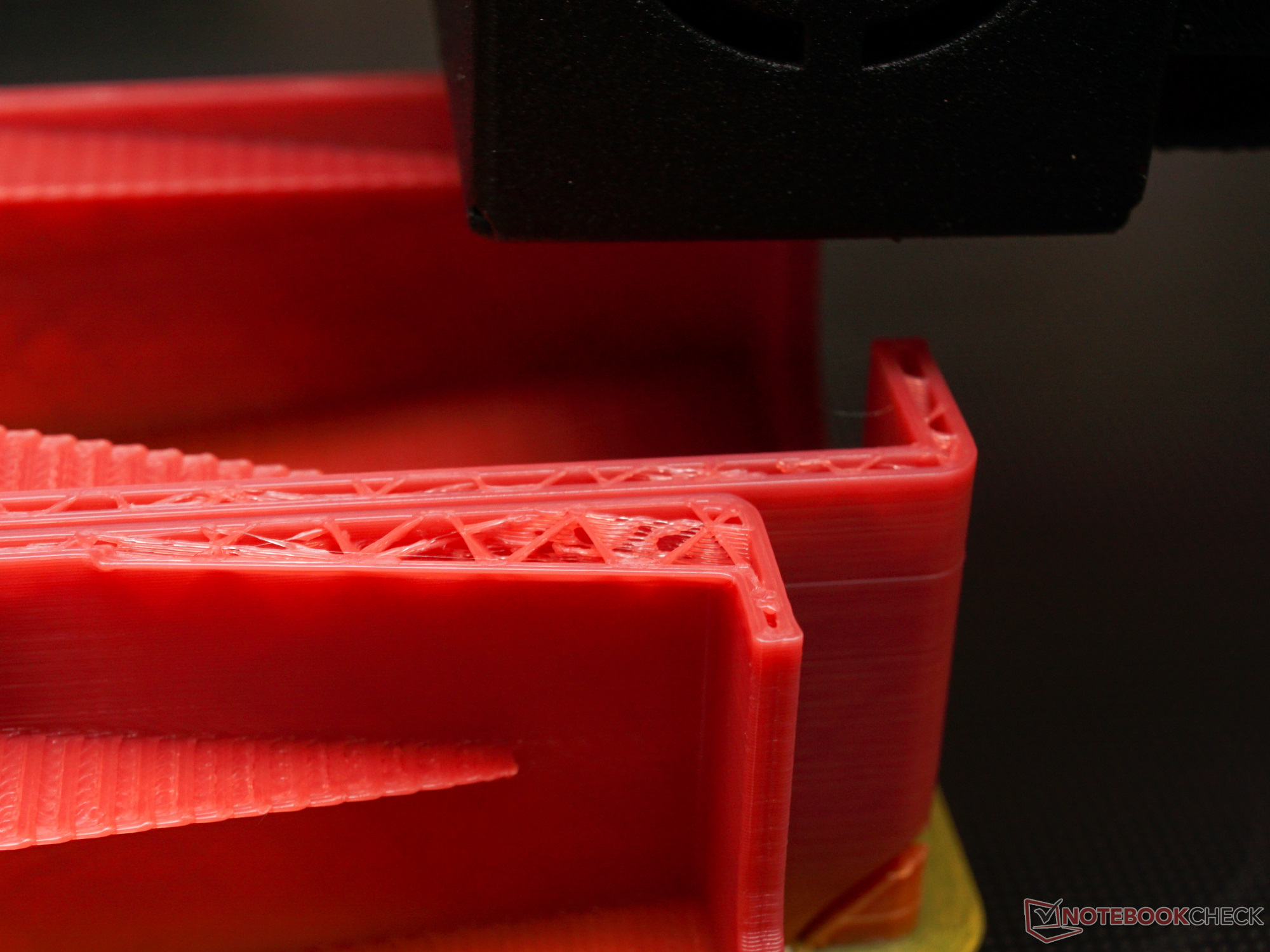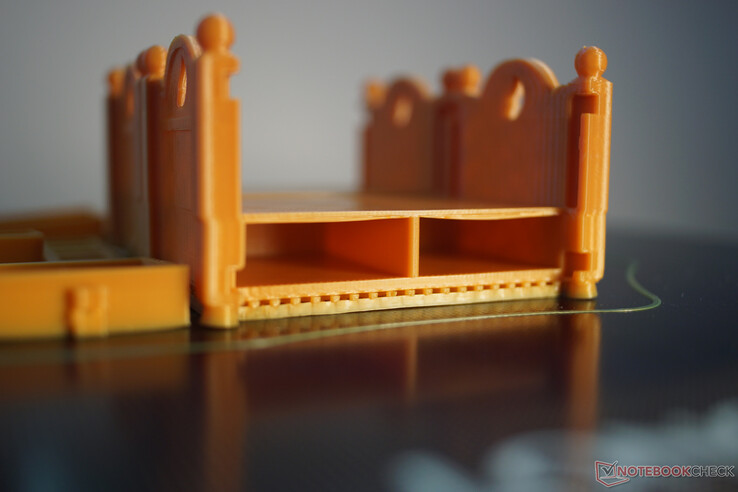 Die maximal mögliche Druckgeschwindigkeit mit dem verwendeten PLA lag bei ungefähr 90 mm/s², darüber kommt der Extruder nicht mehr mit der Filamentförderung hinterher. Es zeigen sich dann Fehlstellen in den gedruckten Linien. Bei allen mit dem Drucker erstellten Objekten war das Druckbild gleichmäßig.