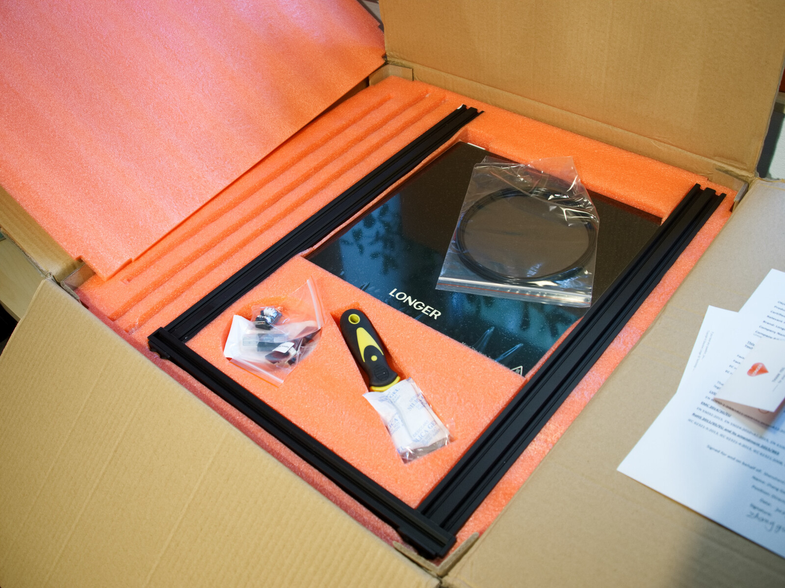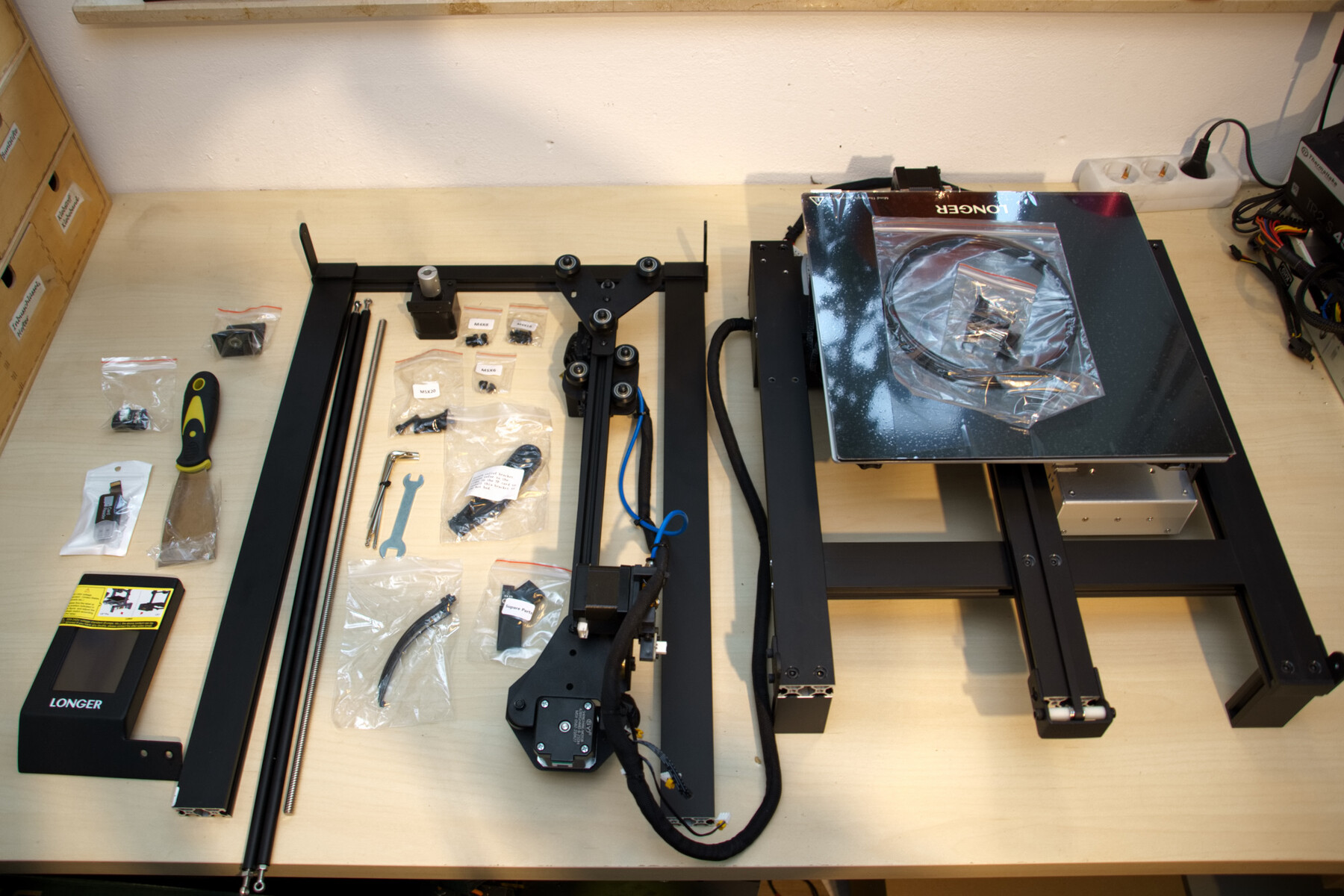 Der erste Aufbau des Longer LK5 Pro hat im Test ungefähr eine halbe Stunde in Anspruch genommen. Nachdem alle Teile aus dem Schaumstoff entnommen waren, ließen sich alle Bauelemente dank der bebilderten Anleitung schnell verbinden. Dabei entfällt die lästige Suche nach den passenden Schrauben und Werkzeugen. Im Paket waren sowohl gut beschriftete Beutel mit den benötigten Schrauben als auch alle benötigten Inbusschlüssel enthalten. Alle Kabel haben kleine Labels, welche die Zuordnung der Stecker erleichtern.