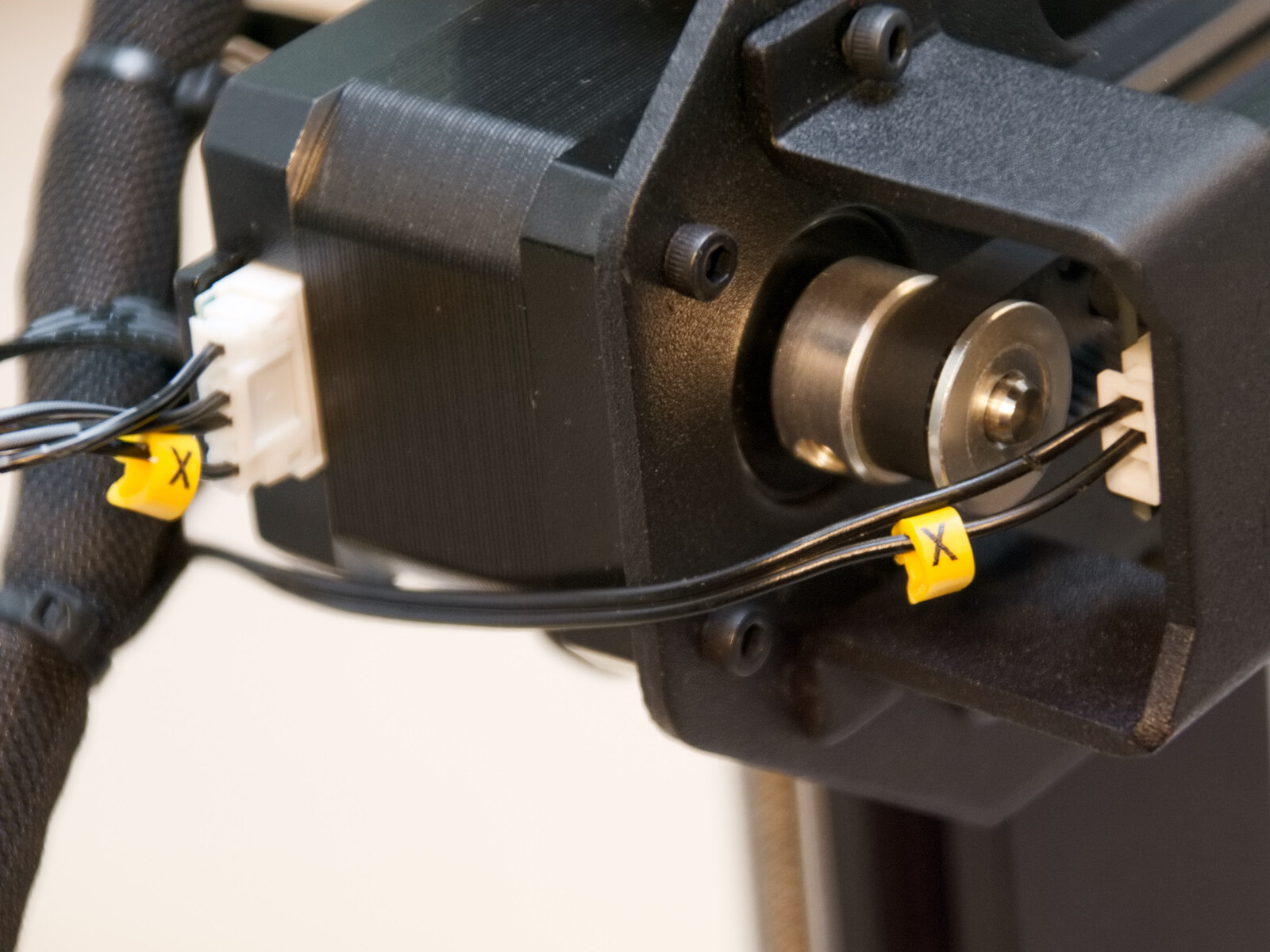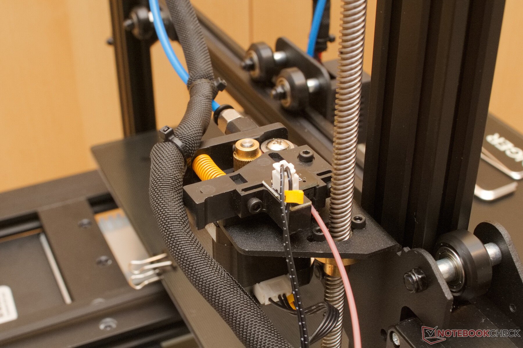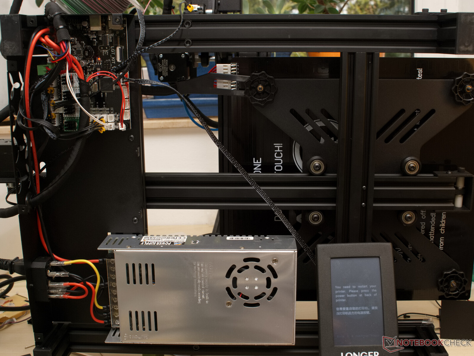 Die Netzspannungsanschlüsse sowie das Netzteil sind ausreichend gegen versehentliches berühren gesichert. Allerdings ist das Kabelmanagement unter der Abdeckung recht Fragwürdig. Die mitgelieferten Kabelbinder ermöglichen es hier etwas Ordnung zu schaffen. Wirklich dringend sollte der Kabelbaum zum Druckbett mittels der Kabelbinder befestigt werden.