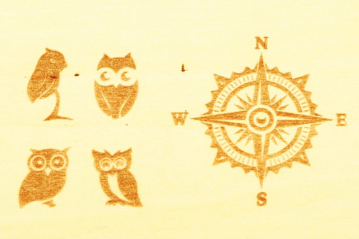 Ein Test mit 3,5 mm starken Pappelsperrholz ergab hervorragende Ergebnisse sowohl beim Gravieren als auch beim Schneiden. Zwei Durchgänge bei 300 mm/min und 100 % Lichtstärke erzeugten hier das beste Schnittbild, bei dem die Schnittlinie nur ca. 0,4 mm breit ist. Dieser Wert ist wichtig für passgenaues Arbeiten bei der Erstellung von Boxen oder ähnlichem aus Sperrholz oder anderen Plattenwerkstoffen. Den als Kerf bezeichneten Verschnitt kann man in vielen Programmen eingeben, um den Laser entsprechend zu steuern.