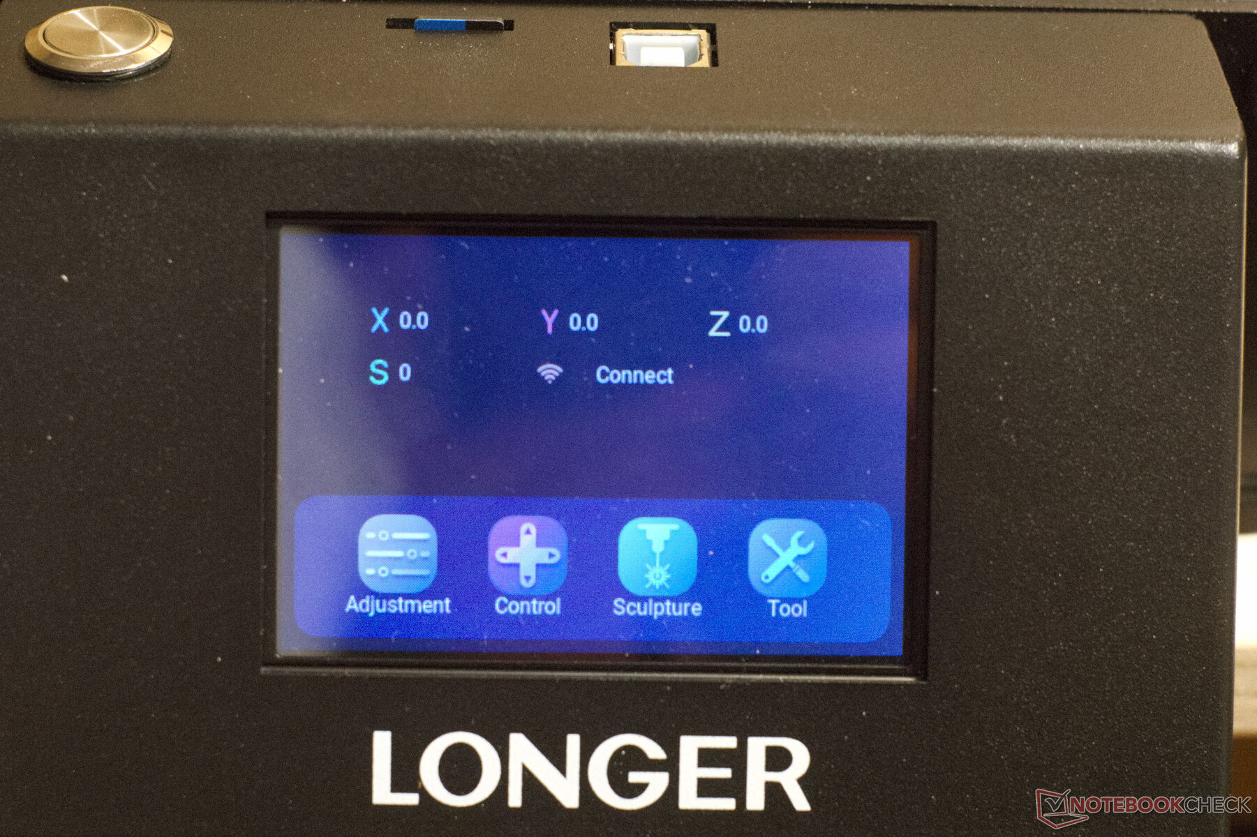 Bevor man einen Gravurvorgang startet, muss man den Laserkopf händisch zum Nullpunkt bewegen, ein automatisches Homing besitzt der Longer RAY5 nicht. Über Sculpture wird die gewünschte Datei ausgewählt. Mittels Frame-Funktion kann vorab geprüft werden, ob das zu bearbeitende Objekt an der richtigen stelle liegt. Der Laser zieht dann einen Rahmen in der Größe der Ausgabe bei geringster Lichtstärke. Nach einem tippen auf Cavre, startet die Gravur.