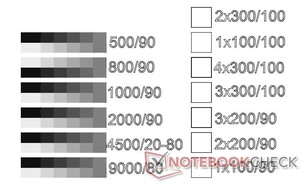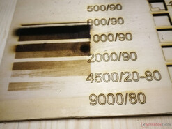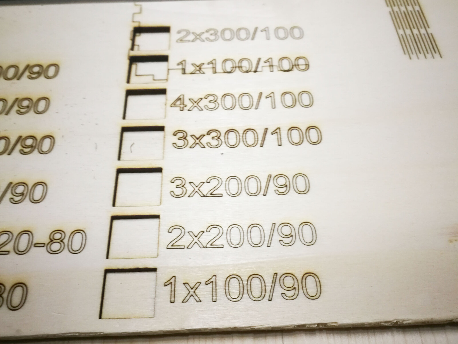 Die Gravur mit 20 bis 100 % Schwarzwert zeigt beim Pappelsperrholz die beste Wirkung bei Geschwindigkeiten zwischen 2000 und 4500 mm/min mit 90 % maximaler Leistung und 20 % minimaler Leistung. Da Holz als natürlicher Rohstoff starken Schwankungen unterliegt, sind die ermittelten Werte eventuell nicht übertragbar auf andere Werkstücke. Bereits bei 1000 mm/min ist die Gravur so tief, dass hier der Test abgebrochen werden musste, und die darunterliegenden Geschwindigkeiten nicht mehr ausgeführt wurden.