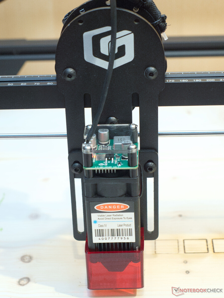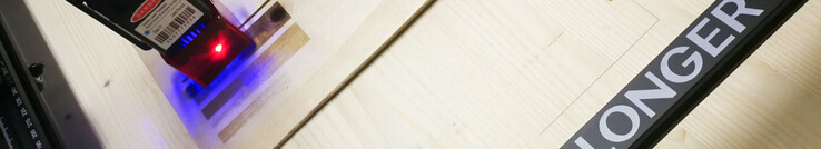 Das 5,5 Watt Laser-Modul überrascht im Test mit starken Ergebnissen. Mitverantwortlich dafür dürfte auch ein im Fokus besonders enger Lichtkegel sein. Longer gibt hier eine quadratische Grundfläche mit 0,08 × 0,08 mm an. Da der Laser einen festen Fokus hat, muss der Laserkopf entsprechend der Objekthöhe eingestellt werden. Dies geht leider nicht werkzeugfrei. Mit einem der beigelegten Innensechskantschlüssel werden dazu die Befestigungsschrauben zu beiden Seiten des Lasers gelöst. Ein beigelegter Aluminiumzylinder hilft dabei die richtige Höhe zu finden. Anschließend können die beiden Schrauben wieder festgezogen werden. Etwas erschwert wird der Vorgang durch die rote Lichtschutzblende.