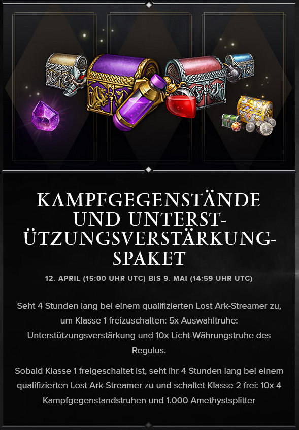 Der zweite Twitch-Drop für weitere vier Stunden Twitch-Watching enthält 10x Kampfgegenstandstruhe (4 Stk.) und 1.000 Amethystsplitter, die ihr gut gebrauchen könnt und euch für lau gönnen könnt. Seht also bis zum 9. Mai, wenn der Drop endet, einfach ganz entspannt euren liebsten Lost-Ark-Streamern auf Twitch zu.