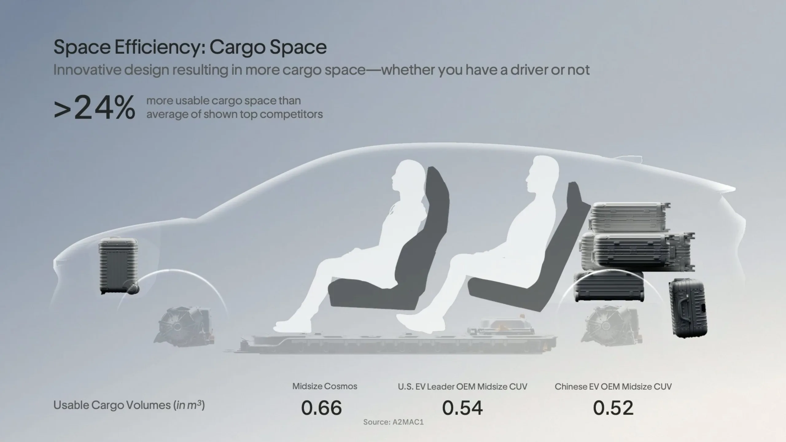Dies ist der neuesten Antriebseinheit von Lucid zu verdanken, die leichter und günstiger ist und gleichzeitig eine um 40 % höhere Leistungsdichte als der „nächste Wettbewerber“ aufweist. Zusammen mit einer deutlich reduzierten Anzahl an Bauteilen im Batteriegehäuse konnte Lucid den Cosmos nicht nur leichter machen und mit einer kleineren Batterie weiter fahren lassen, sondern auch 24 % mehr nutzbaren Stauraum als seine Hauptkonkurrenten schaffen.