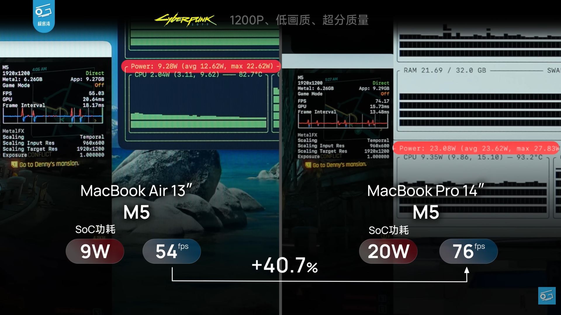 Der koreanische Technik-Reviewer Geekerwan berichtet, dass das MacBook Air 13 M5 in Cyberpunk 2077 bei 1200p/niedrig mit MetalFX-Upsampling nur 9 Watt verbraucht und dabei 54 FPS erreicht. Das MacBook Pro 14 M5 kam hingegen bei einem Verbrauch von 20 Watt auf 76 FPS. Das entspricht einem gewaltigen Leistungsunterschied von 40,7 Prozent zwischen den beiden Laptops.